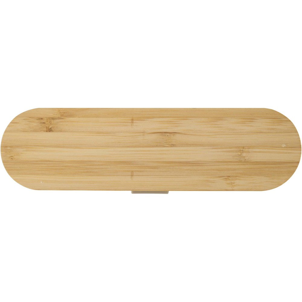 A reusable cutlery set with a bamboo lid, including a fork, knife, spoon, straw, and straw cleaner ? ideal for meals on the go. Compact and easy to clean, it?s perfect for lunch boxes, travel, or office use.