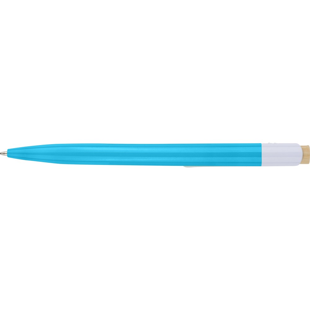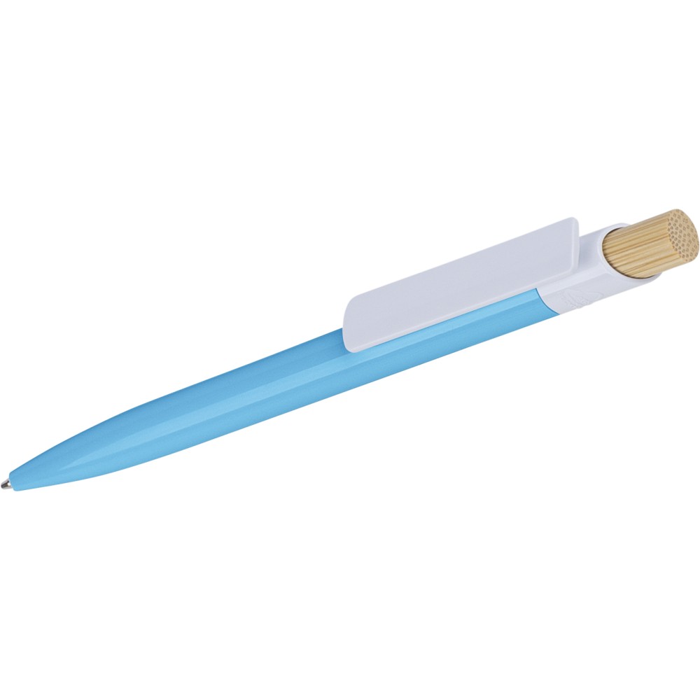 Recycled ABS ballpen with bamboo push button and white clip, suitable for digital printing. Features a recycled logo in the in-mould. Approximate writing length of 600 metres. Blue ink.