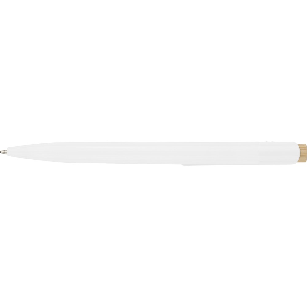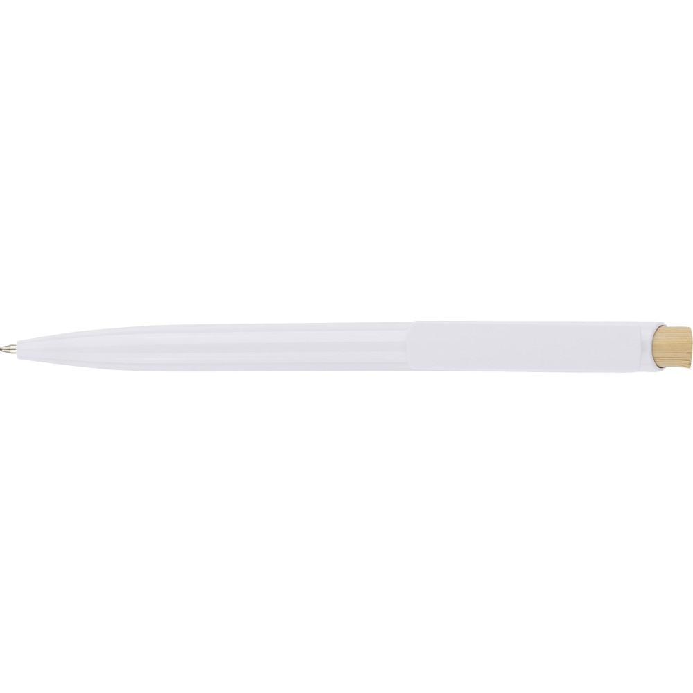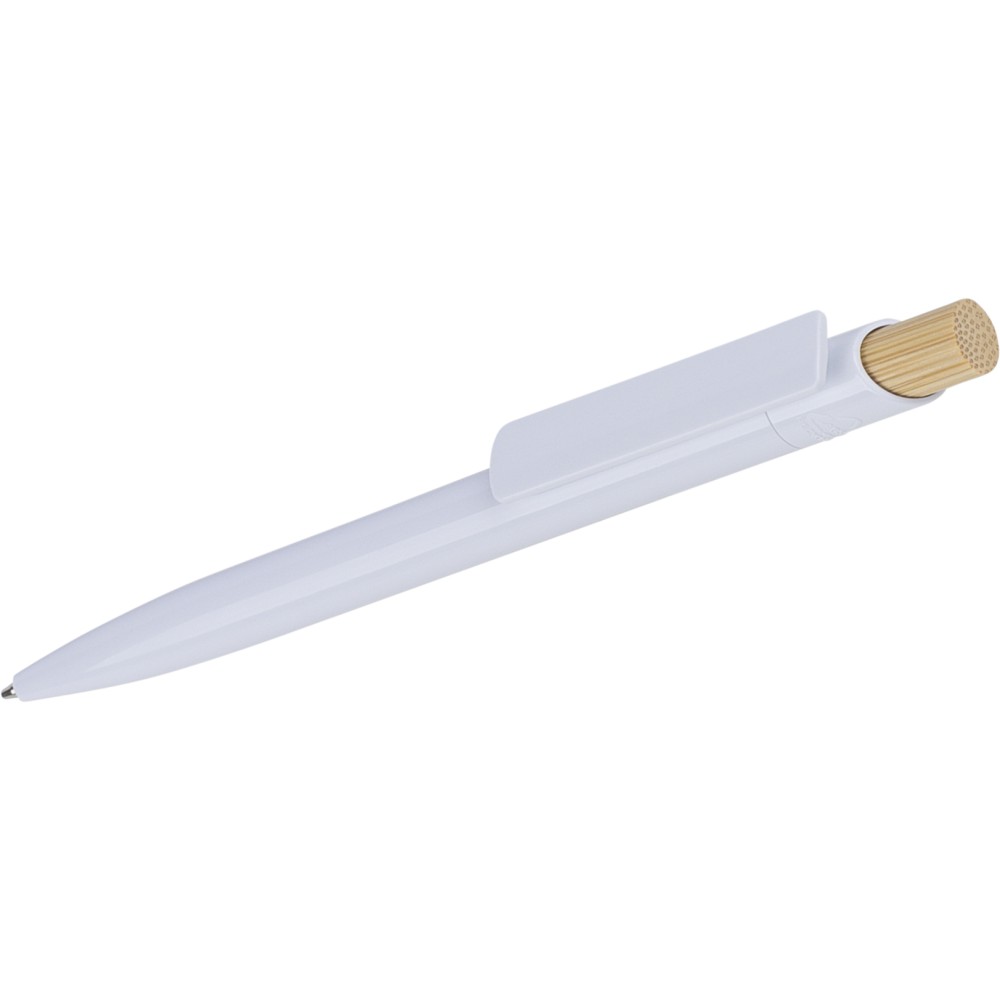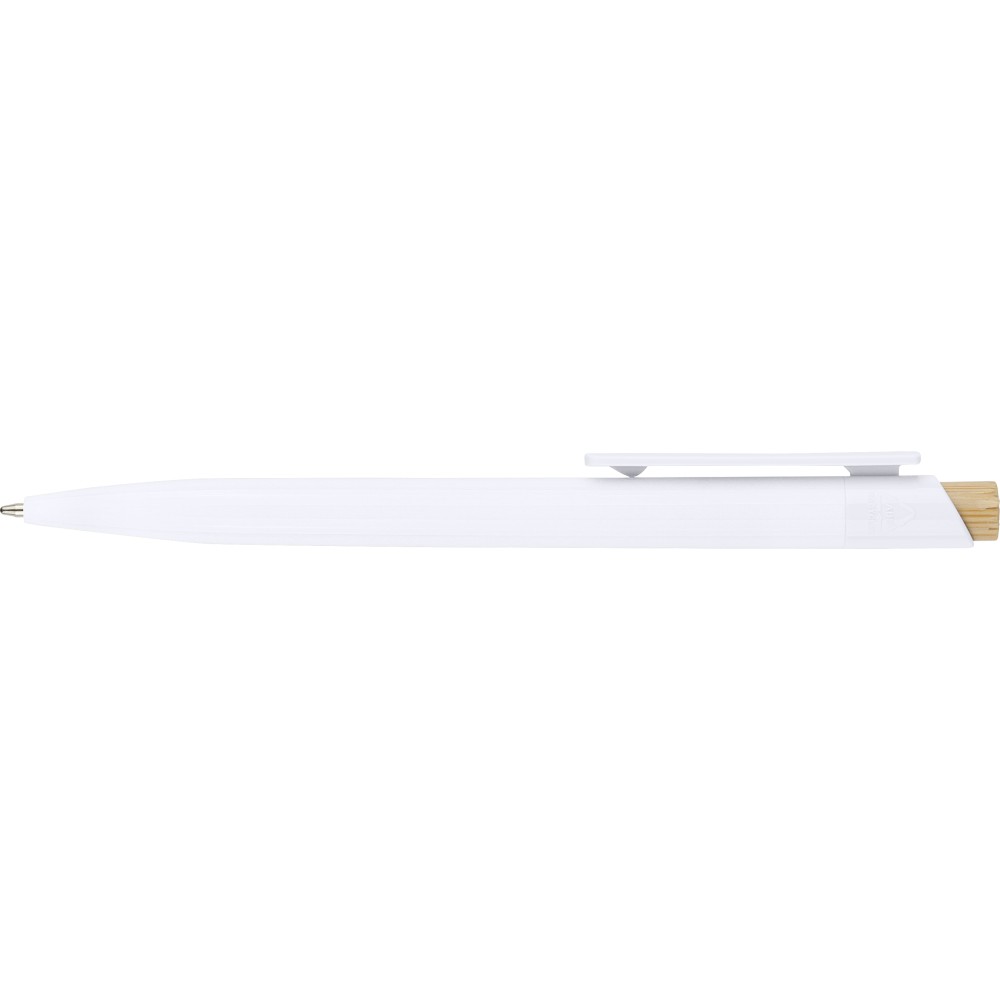 Recycled ABS ballpen with bamboo push button and white clip, suitable for digital printing. Features a recycled logo in the in-mould. Approximate writing length of 600 metres. Blue ink.