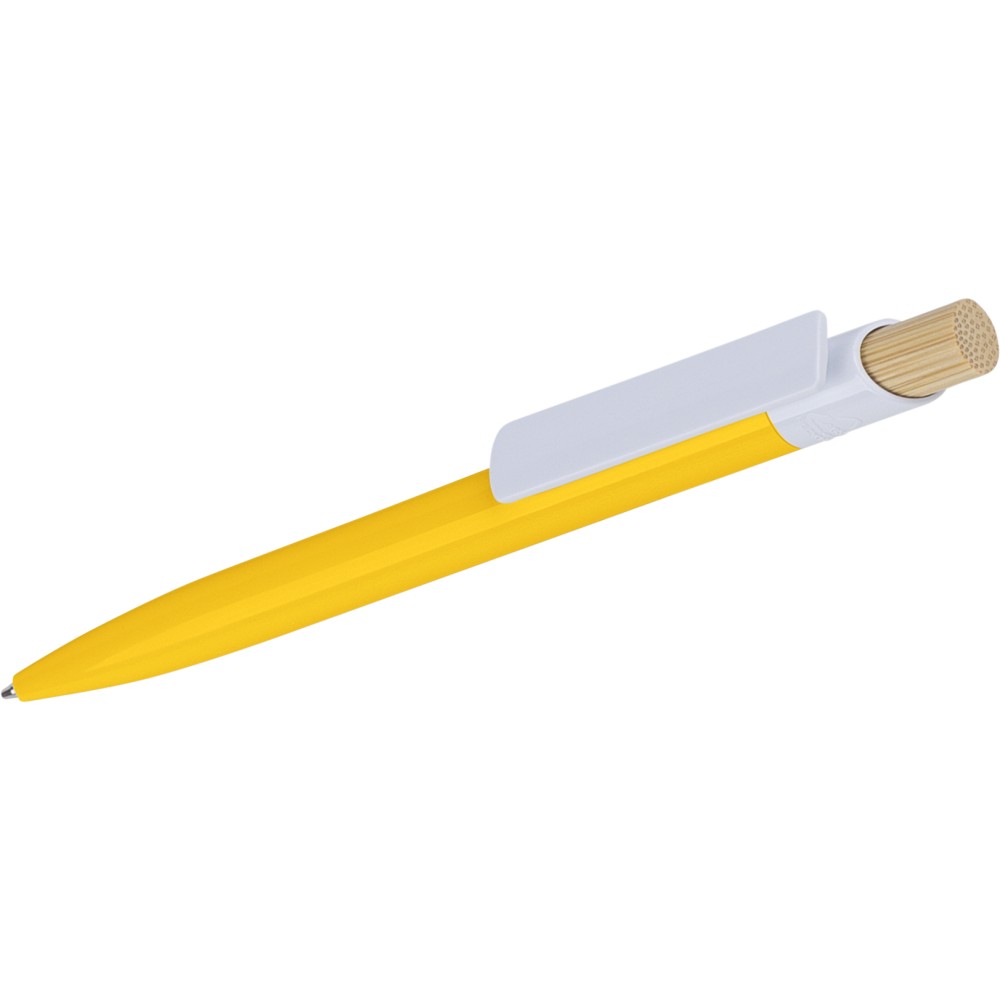 Recycled ABS ballpen with bamboo push button and white clip, suitable for digital printing. Features a recycled logo in the in-mould. Approximate writing length of 600 metres. Blue ink.