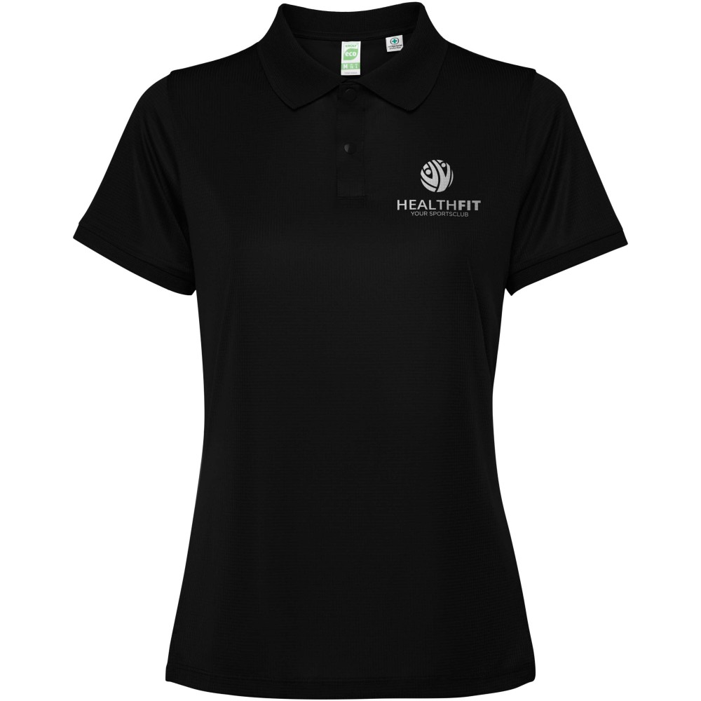 Short-sleeve fitted polo shirt for women. Reinforced covered seams in interior collar. 1x1 ribbed cuffs and collar. Side seams. 3-button placket and side slits. Printing: Embroidery, Screen-printing