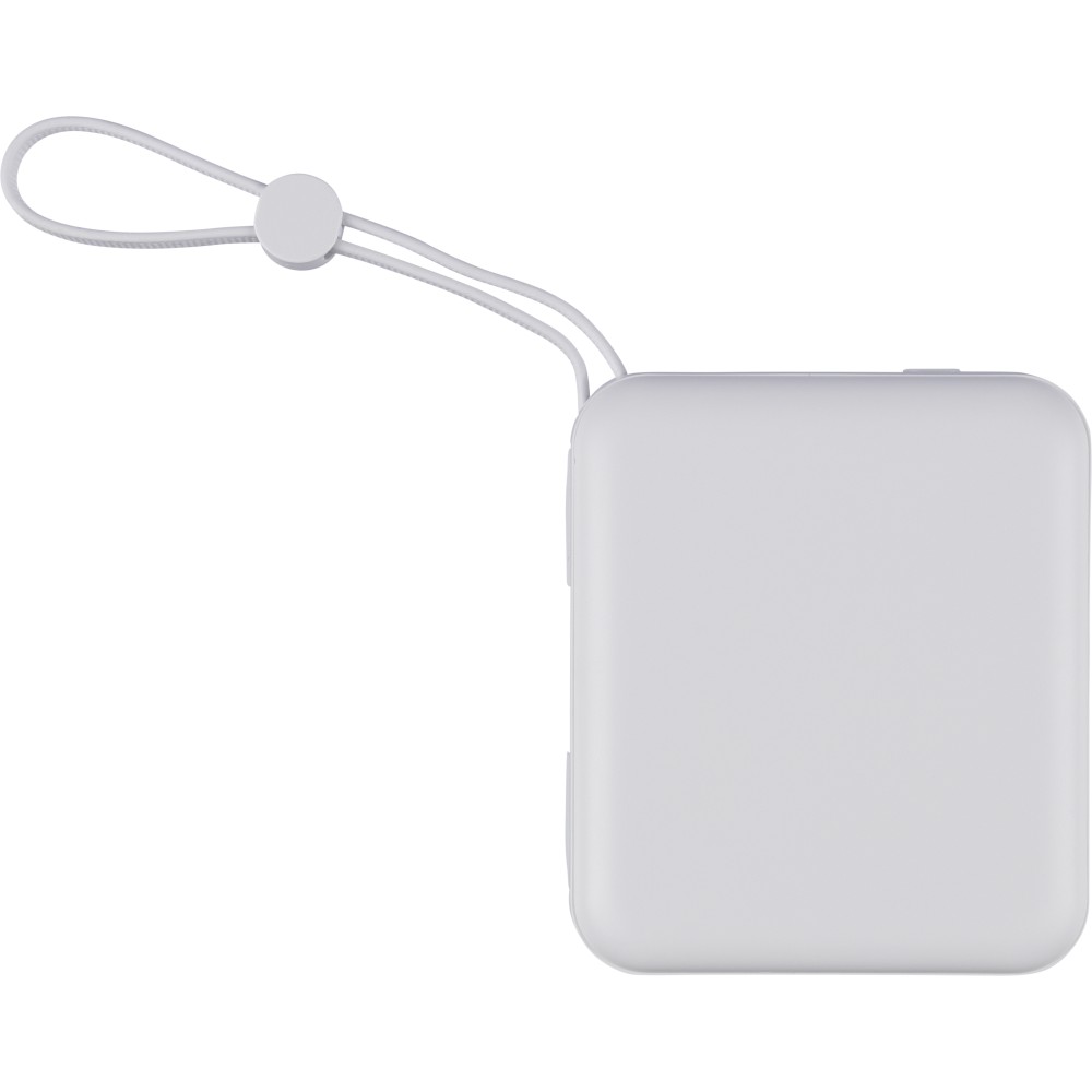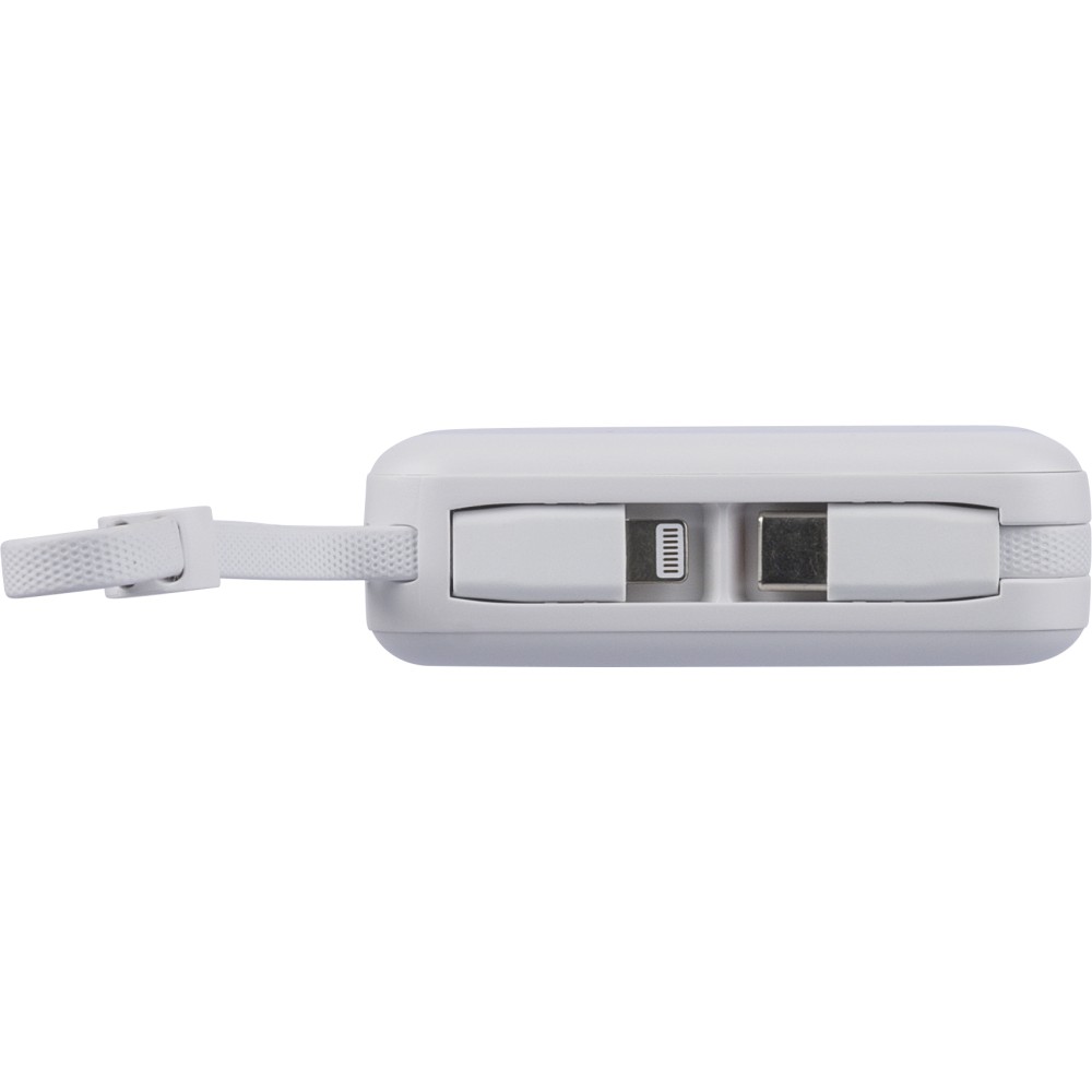 Recycled ABS powerbank with 10,000 mAh Li-ion battery and 22.5W fast charging. Integrated TPE cable with Lightning and Type-C connectors. LED battery display, Type-C in/out, Type-A input. Safety protections included. Recycled ABS logo on back. Packed in brown cardboard box with tissue paper.