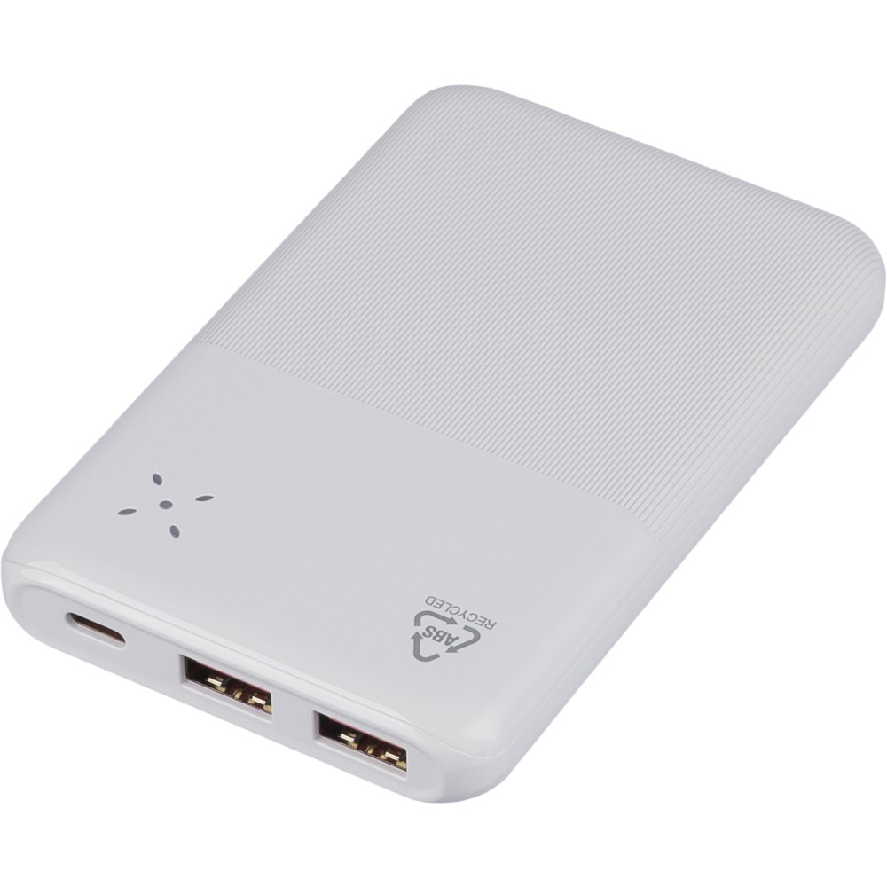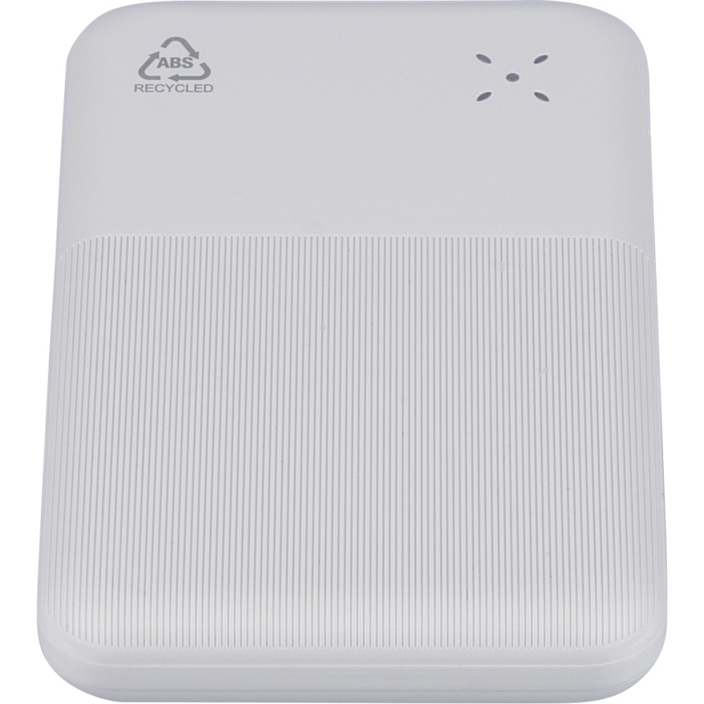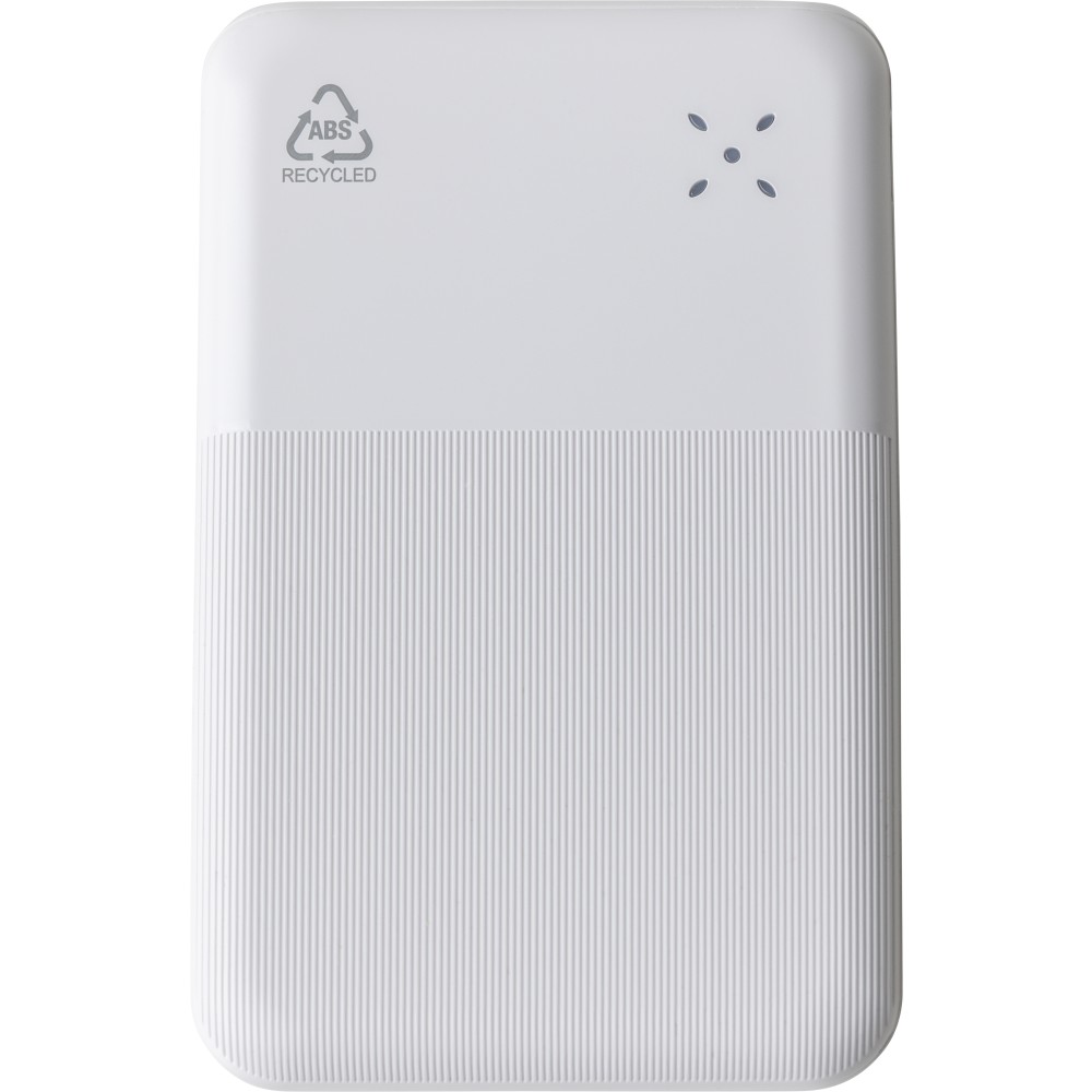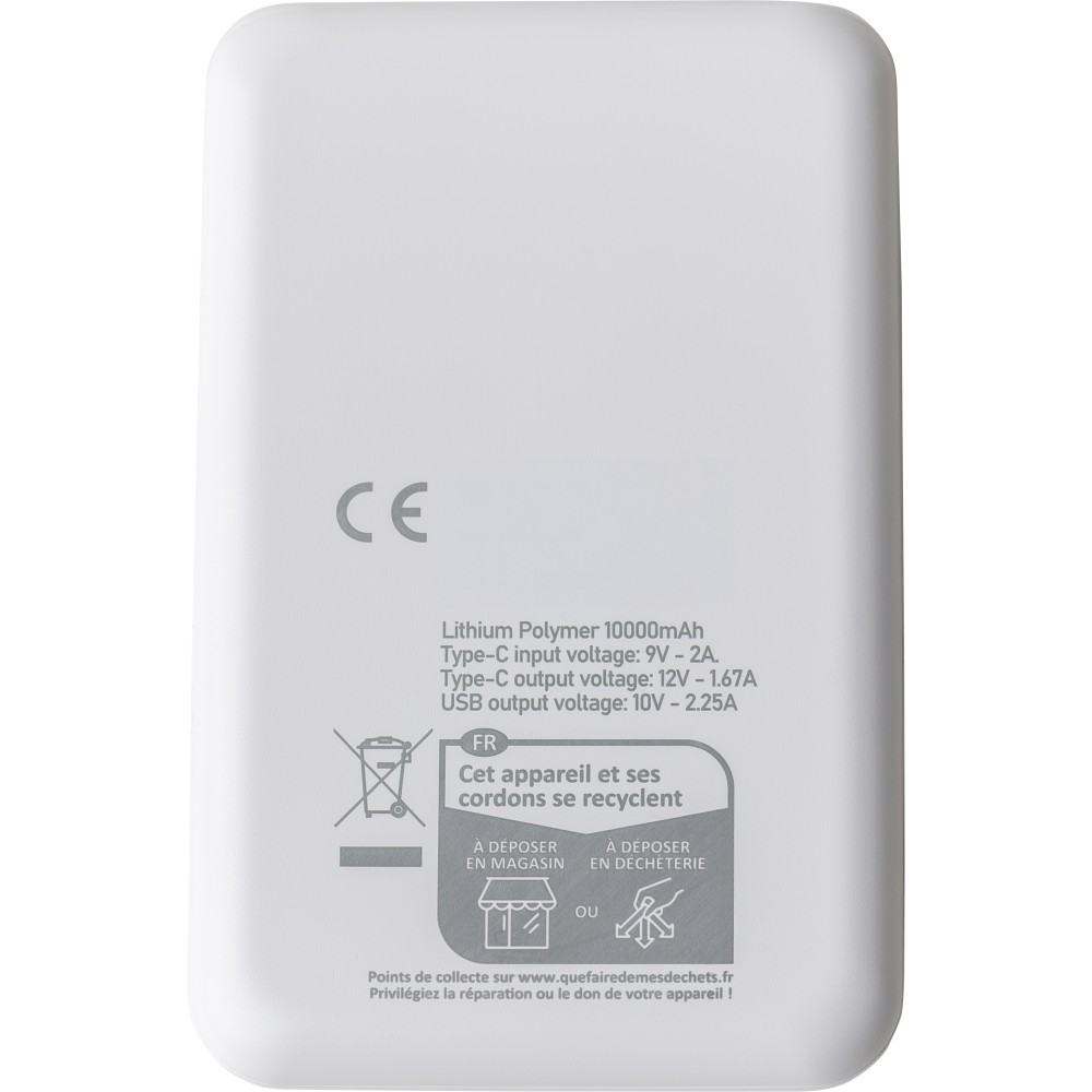 Recycled ABS powerbank (10,000 mAh). 22.5W fast charging. Type-C in/out, Type-A input. Digital display, smooth/textured design. Safety protections. Recycled ABS logo on back. Packed in brown box with tissue paper. Printing: UV printing