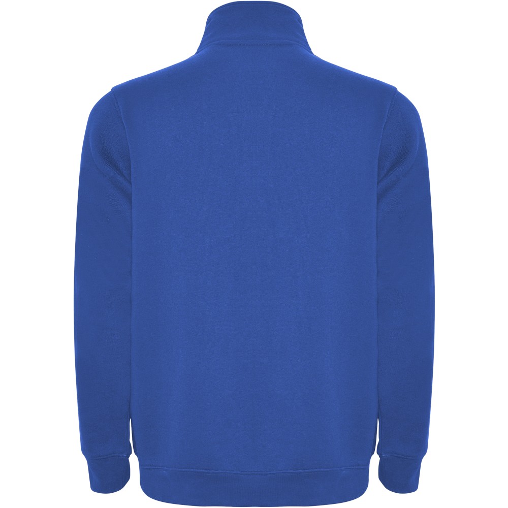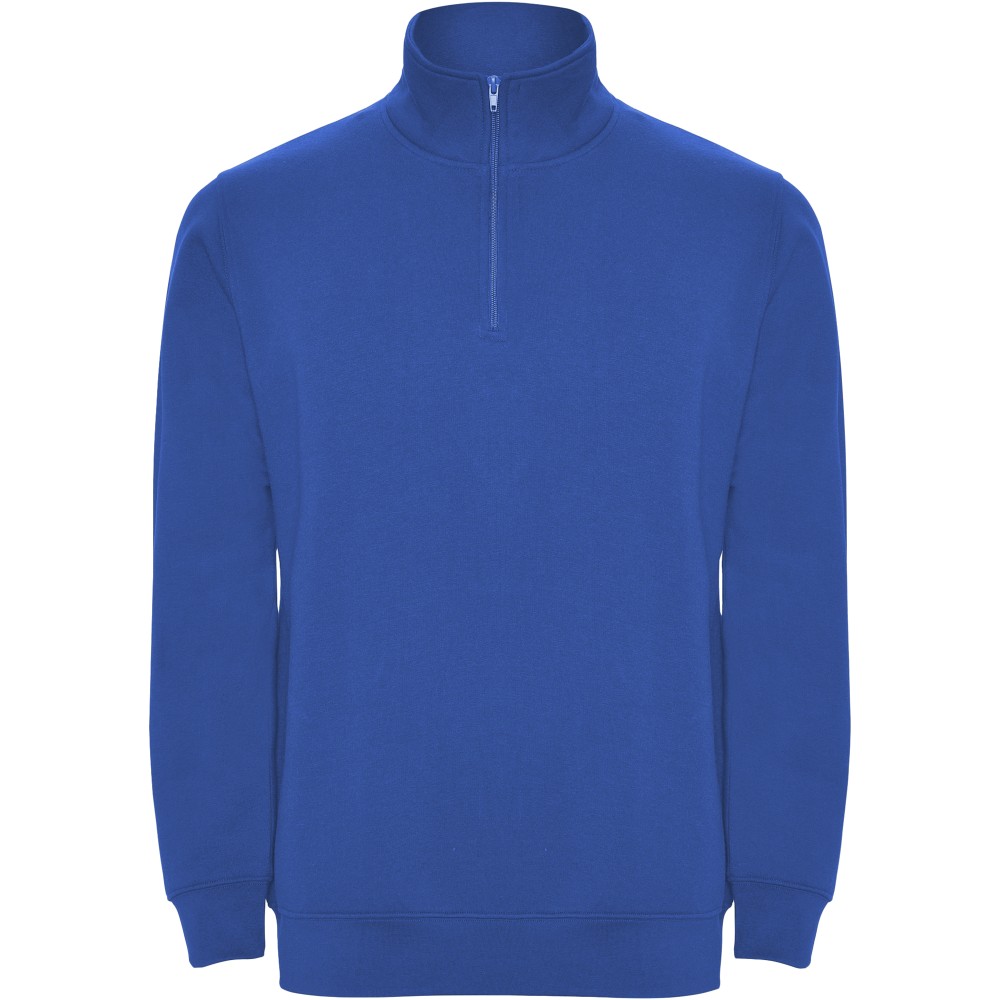 Sweatshirt with matching half zip and polo neck. Matching inner collar. Reinforced covered seams on inner collar. 1x1 ribbed cuffs and waist. The model is 185 cm and is wearing size M. Knit of 50% Cotton and 50% Polyester, 280 g/m2. Printing: Embroidery, Screen-printing