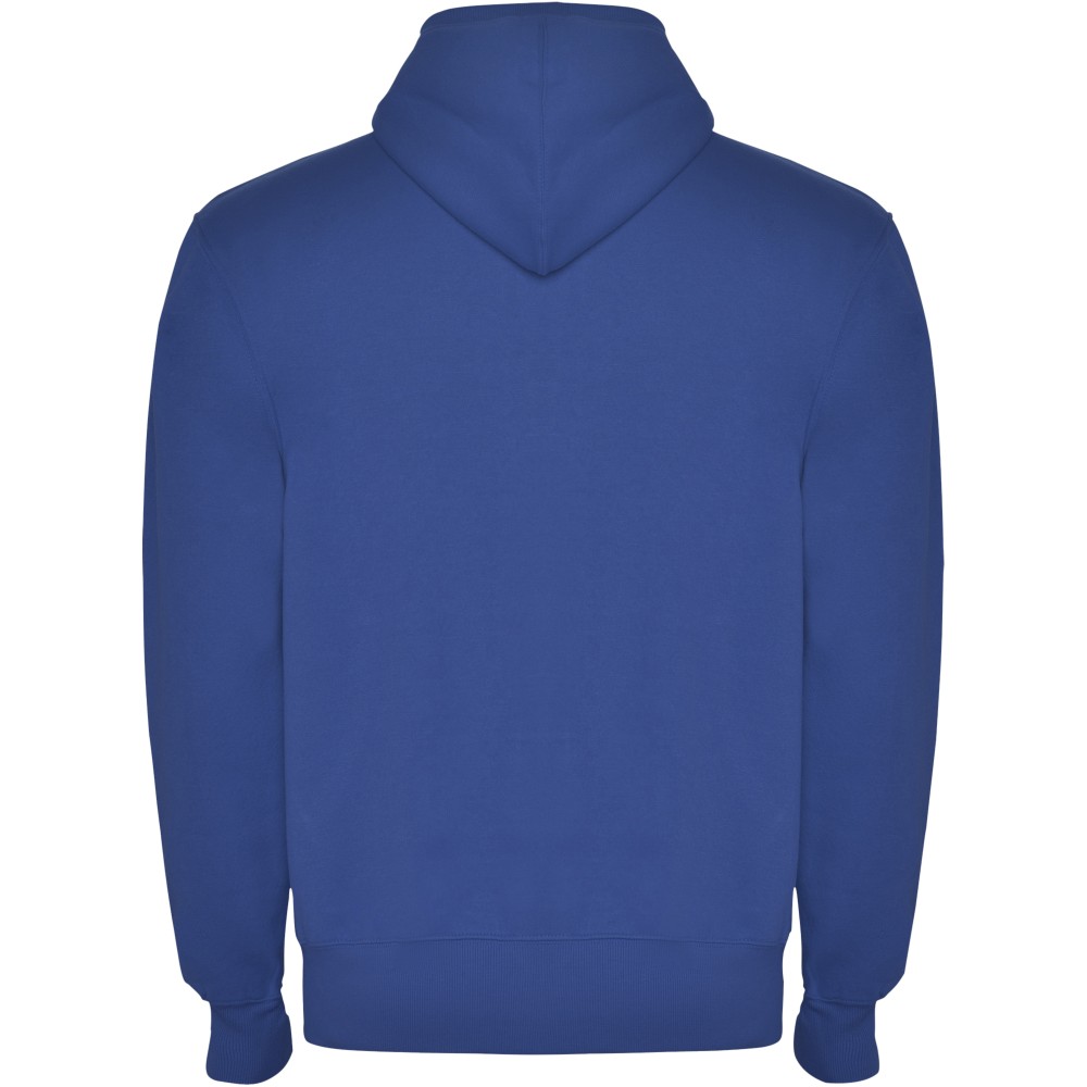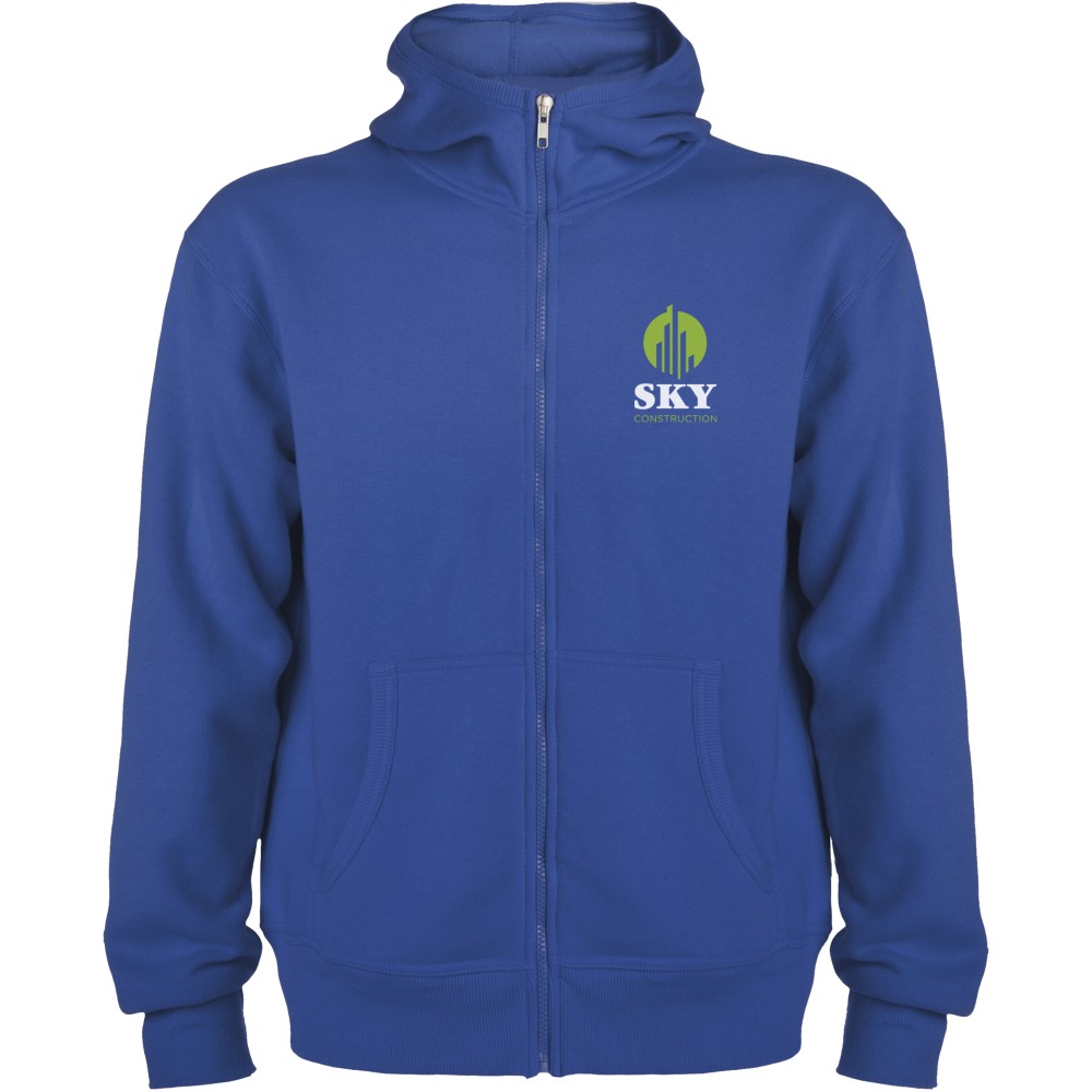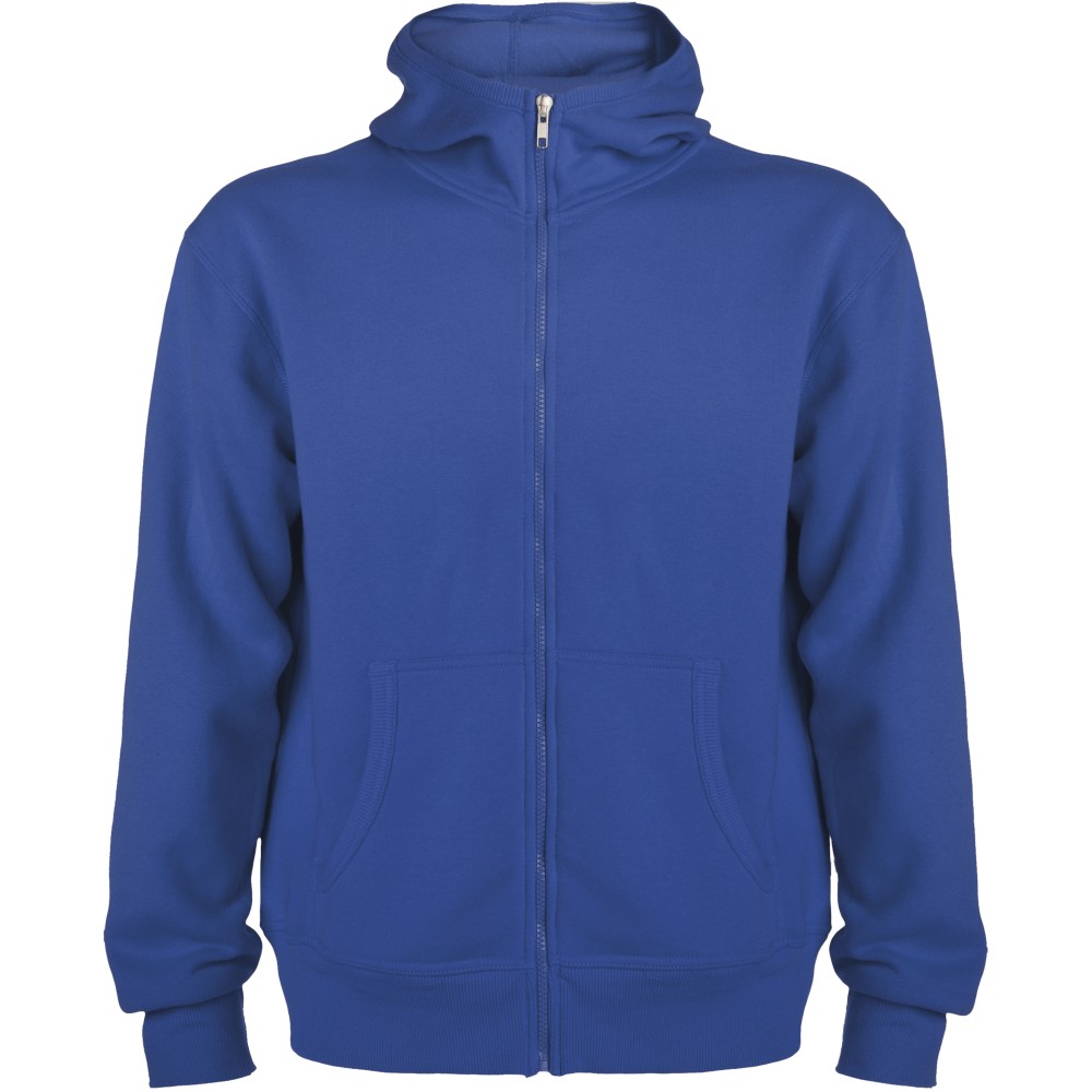 Sweat hooded jacket with high neck and full zip. Ribbed detail in hood and pocket piping. Kangaroo style pocket. 2x2 rib in cuffs and waist. Kids sizes available. Removable label. The model is 184 cm and is wearing size L. Knit of 50% Cotton and 50% Polyester, 280 g/m2. Printing: Embroidery, Screen-printing