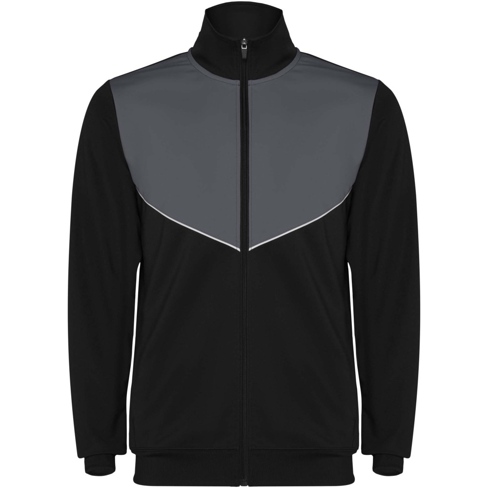 Tracksuit in lightweight and elastic fabric. Jacket with contrasting colour and sewing trims on the chest. High collar with contrasting seams. Center front zip. Side pockets. 2x2 ribbed cuffs and waist. Trousers with elastic waistband and drawstring. Contrasting side piece with sewing trim. Zipped hem. Printing: Embroidery, Screen-printing
