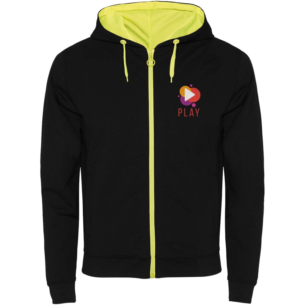 Sweat jacket in non-brushed fleece with details in fluor colour. Central zip with contrasting puller. Hood with lining in microperforated polyester fabric and contrasting fluor colour. Drawcord and metal eyelets in contrasting fluor colour. 1x1 rib in cuffs and waist. Two front pockets with wide trim. Reinforced covered seams on inner collar. Removable label. Printing: Embroidery, Screen-printing