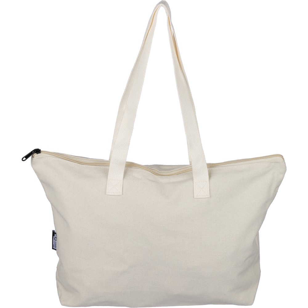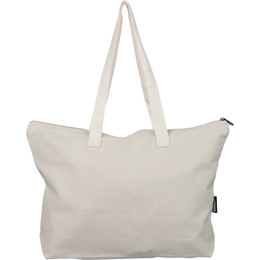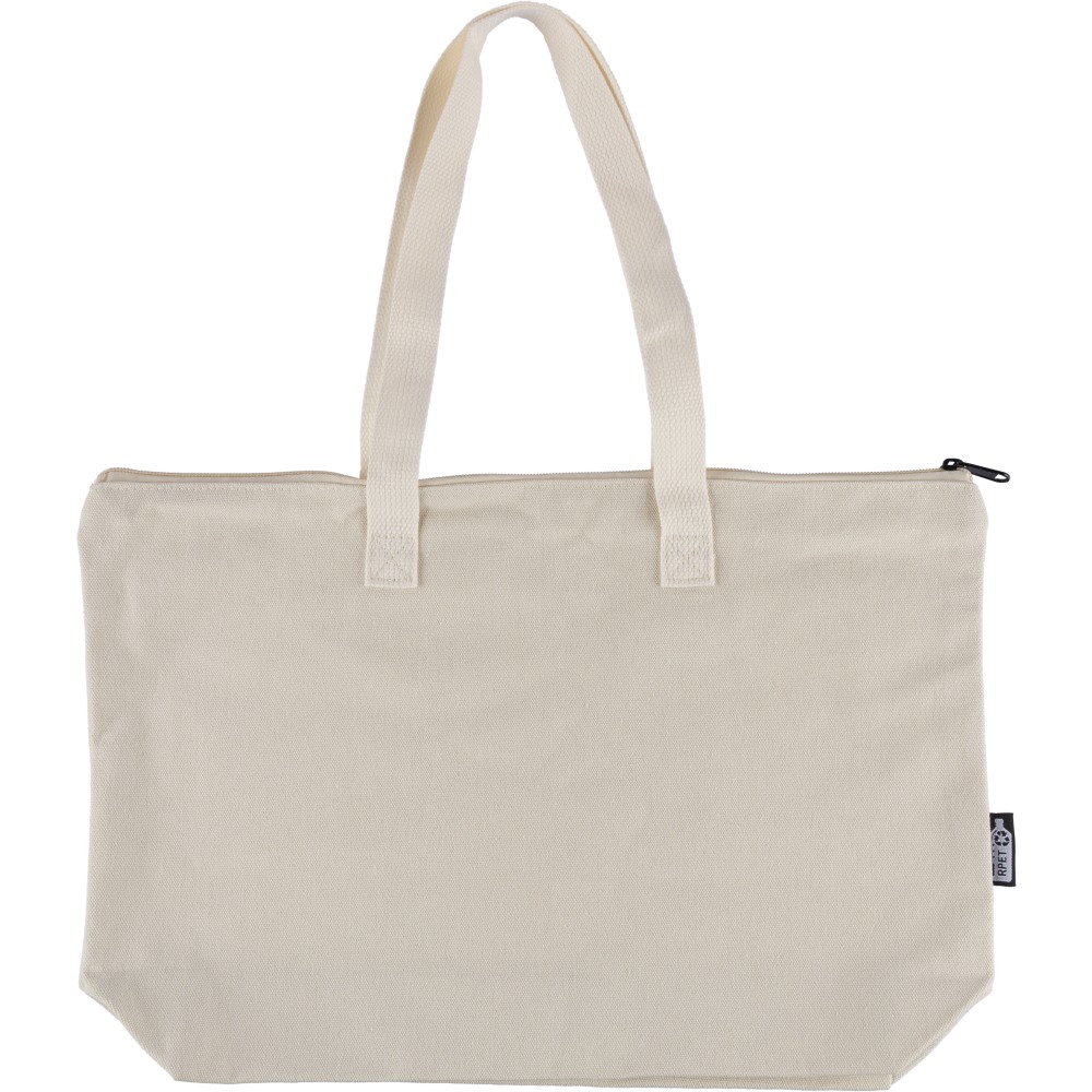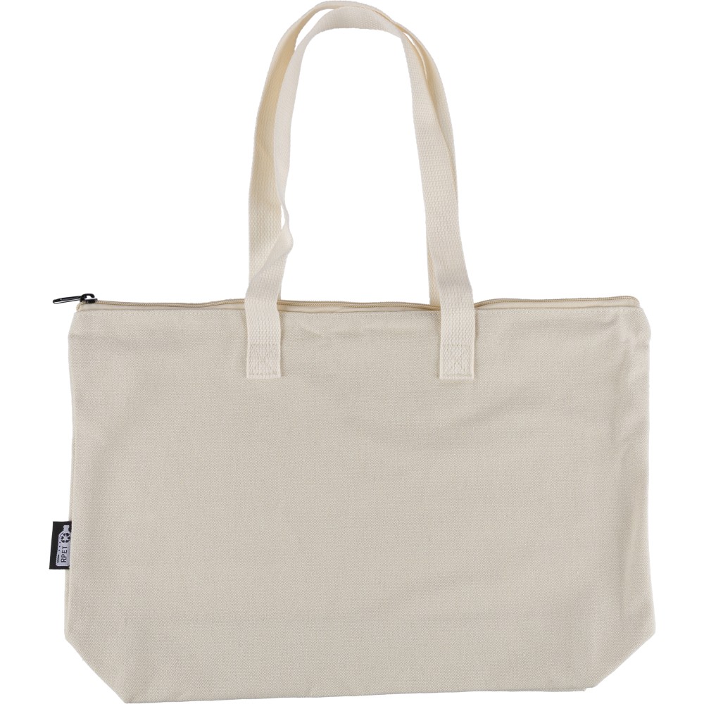 Recycled polycotton (330 gsm) tote bag with large zippered top compartment. Features long carrying handles (65 cm length, 2.5 cm width) and matching webbing. Includes rPET label on the outside and a label inside.