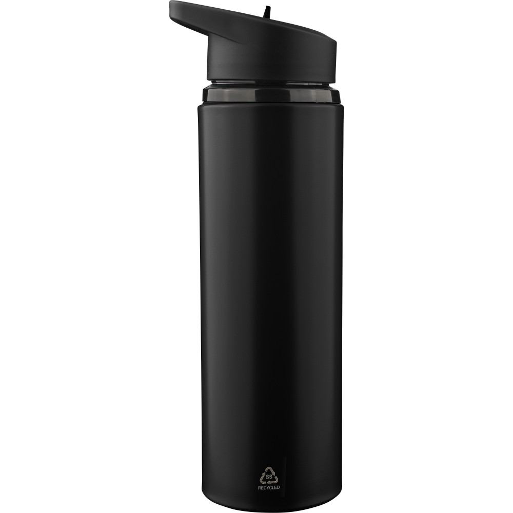 Recycled stainless steel drinking bottle (500 ml), single-walled with stainless steel 304, PP screw lid with carrying loop, foldable spout, and internal straw. Suitable for cold drinks only. Engraved recycled logo. Packed in a brown cardboard box.