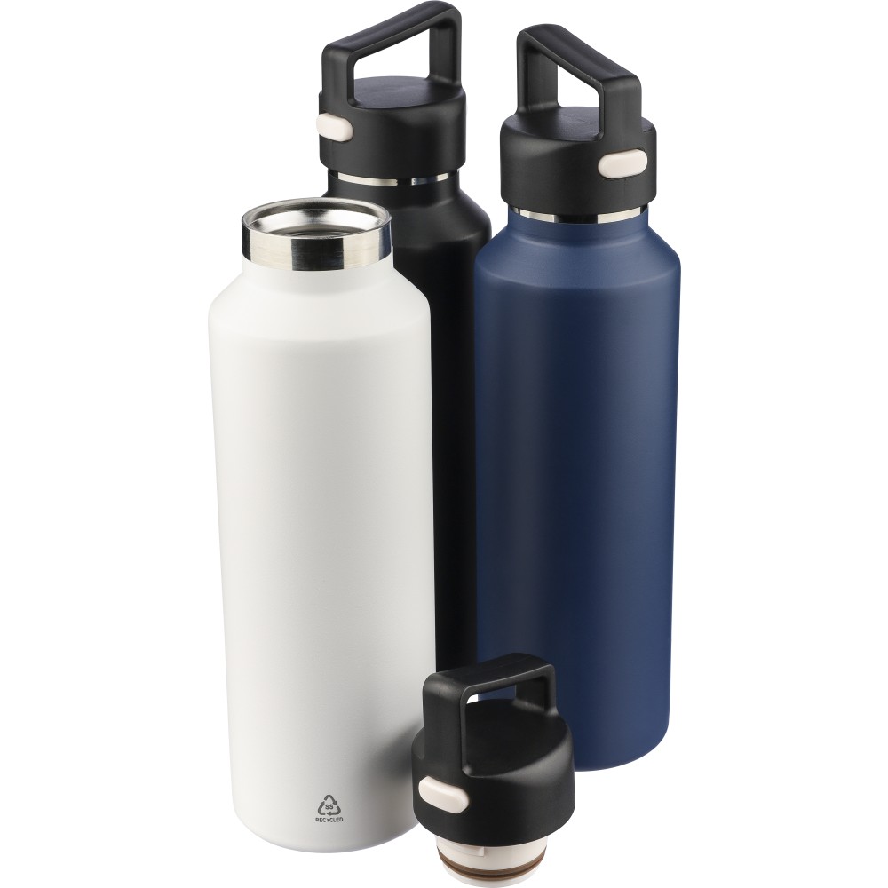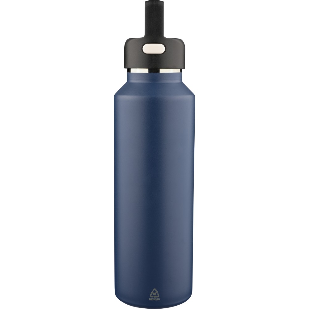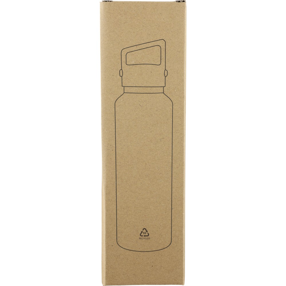 Recycled stainless steel vacuum bottle (600 ml) with double-wall construction, PP lid with carry loop, dual push-button lid opening, and laser-engraved recycled logo. Packed in a brown cardboard box.