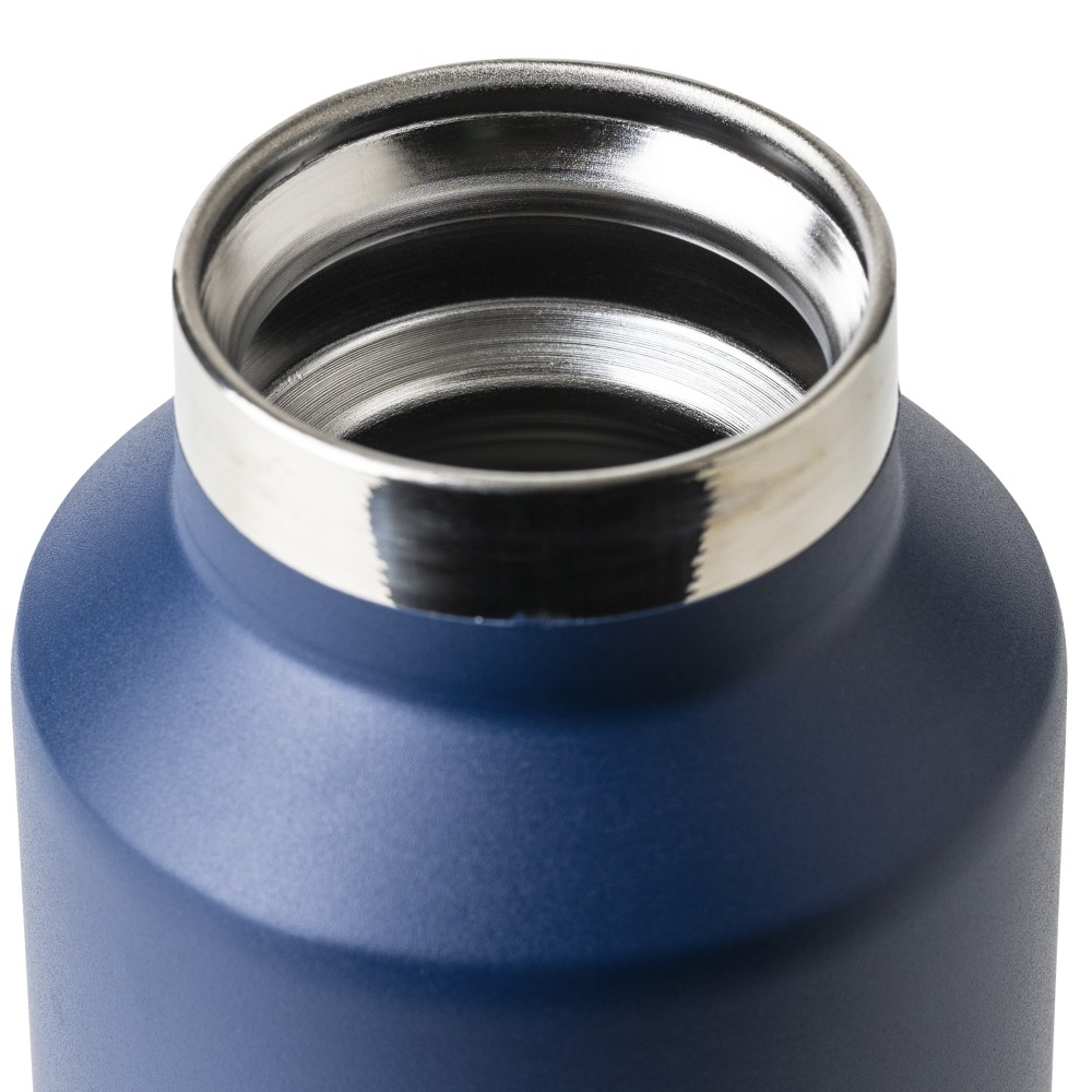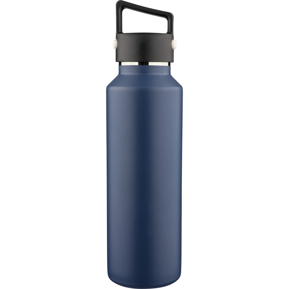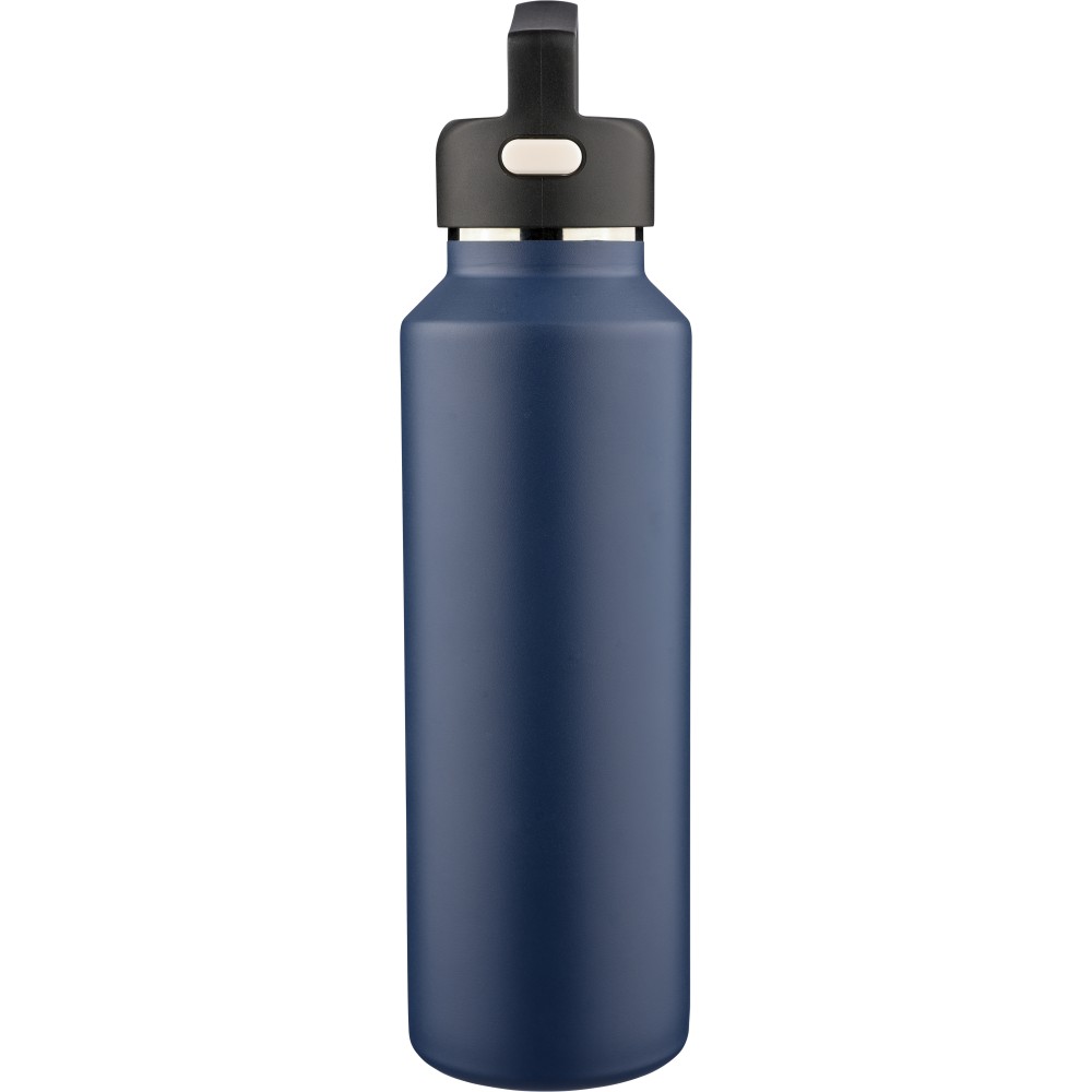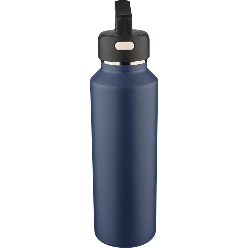 Recycled stainless steel vacuum bottle (600 ml) with double-wall construction, PP lid with carry loop, dual push-button lid opening, and laser-engraved recycled logo. Packed in a brown cardboard box.
