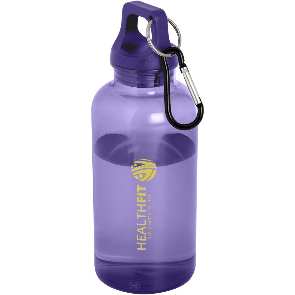 Staying hydrated at all times is possible with this durable yet lightweight 400 ml water bottle made from recycled plastic. It is the perfect companion while exercising, on day trips or at the office. The single walled Oregon bottle has a twist-on lid and offers plenty of space to add any kind of logo. Clip the attached carabiner (not suitable for climbing) securely to a bag to avoid losing it. BPA Free and tested and approved under German Food Safe Legislation (LFGB) and for phthalates content under REACH. The lid and body are composed of 100% recycled plastic. Printing: Pad printing