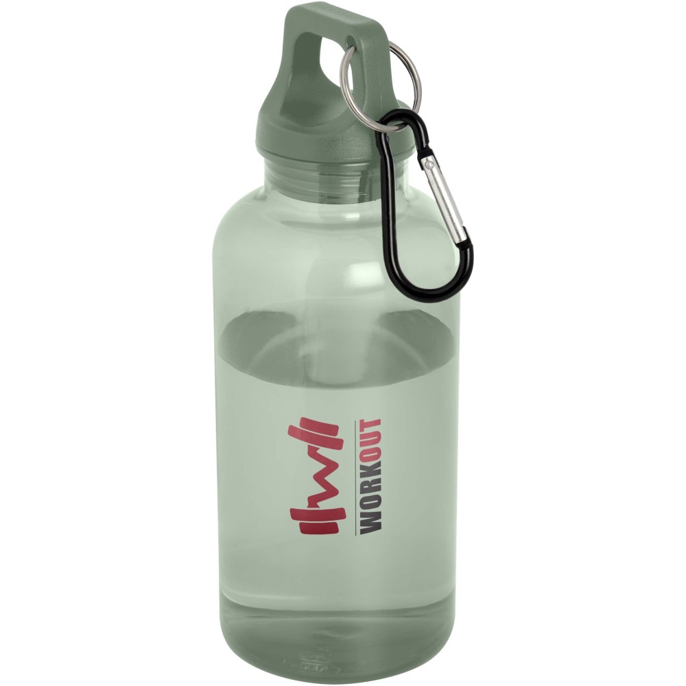 Staying hydrated at all times is possible with this durable yet lightweight 400 ml water bottle made from recycled plastic. It is the perfect companion while exercising, on day trips or at the office. The single walled Oregon bottle has a twist-on lid and offers plenty of space to add any kind of logo. Clip the attached carabiner (not suitable for climbing) securely to a bag to avoid losing it. BPA Free and tested and approved under German Food Safe Legislation (LFGB) and for phthalates content under REACH. The lid and body are composed of 100% recycled plastic. Printing: Pad printing