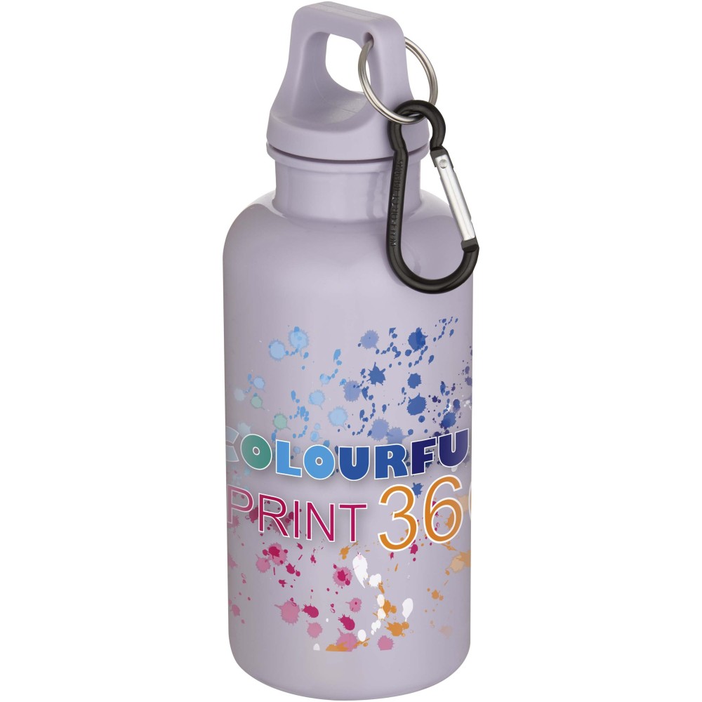 Staying hydrated at all times is possible with this durable yet lightweight 400 ml water bottle made from RCS certified recycled PET. It is the perfect companion while exercising, on day trips or at the office. The single-walled Oregon bottle has a twist-on lid and offers plenty of space to add any kind of logo. Clip the attached carabiner (not suitable for climbing) securely to a bag to avoid losing it. Manufactured in compliance with the EFSA approved PET recycling process.