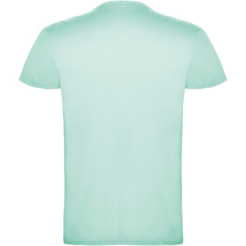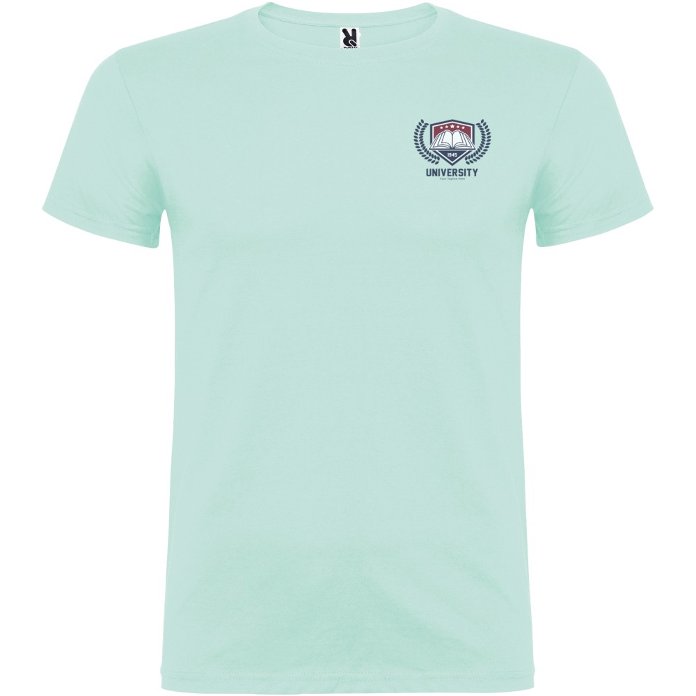 Short-sleeve t-shirt with double layer crew neck in elastane, made in tubular fabric for adults. Reinforced covered seams in collar. Removable label. The model is 190 cm and is wearing size L. Single Jersey knit of 100% Cotton, 155 g/m2. Printing: Embroidery, Screen-printing