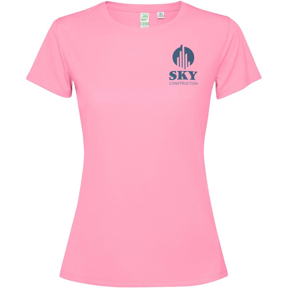 Short-sleeved fitted technical t-shirt for women. Collar with matching seams. Back hem slightly longer than the front. Side seams shifted forward. Printing: Embroidery, Screen-printing