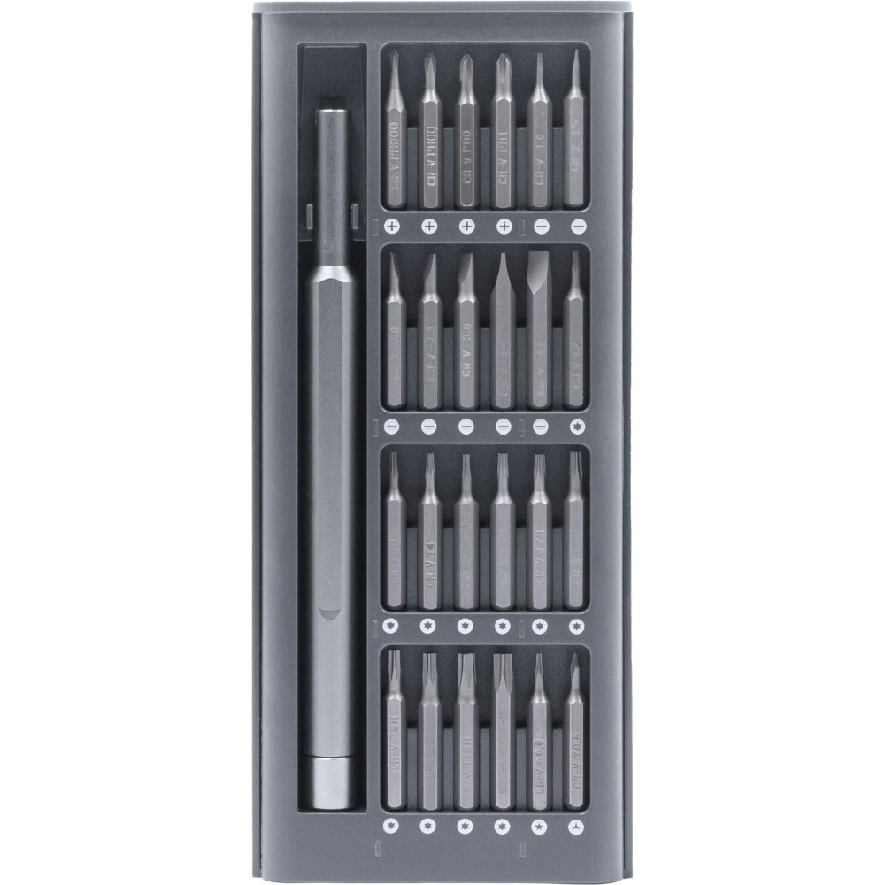 The Everybit Lite multi-tool is perfect for repairing a wide range of devices, including smartphones, MacBooks, iPads, electronics, watches, cameras, laptops, eyeglasses, circuit boards, toys, PCs, and game consoles. It features 24 magnetic precision bits made from durable CRV steel and an aluminum alloy handle for a comfortable grip. Ideal for all your repair needs. Printing: Pad printing