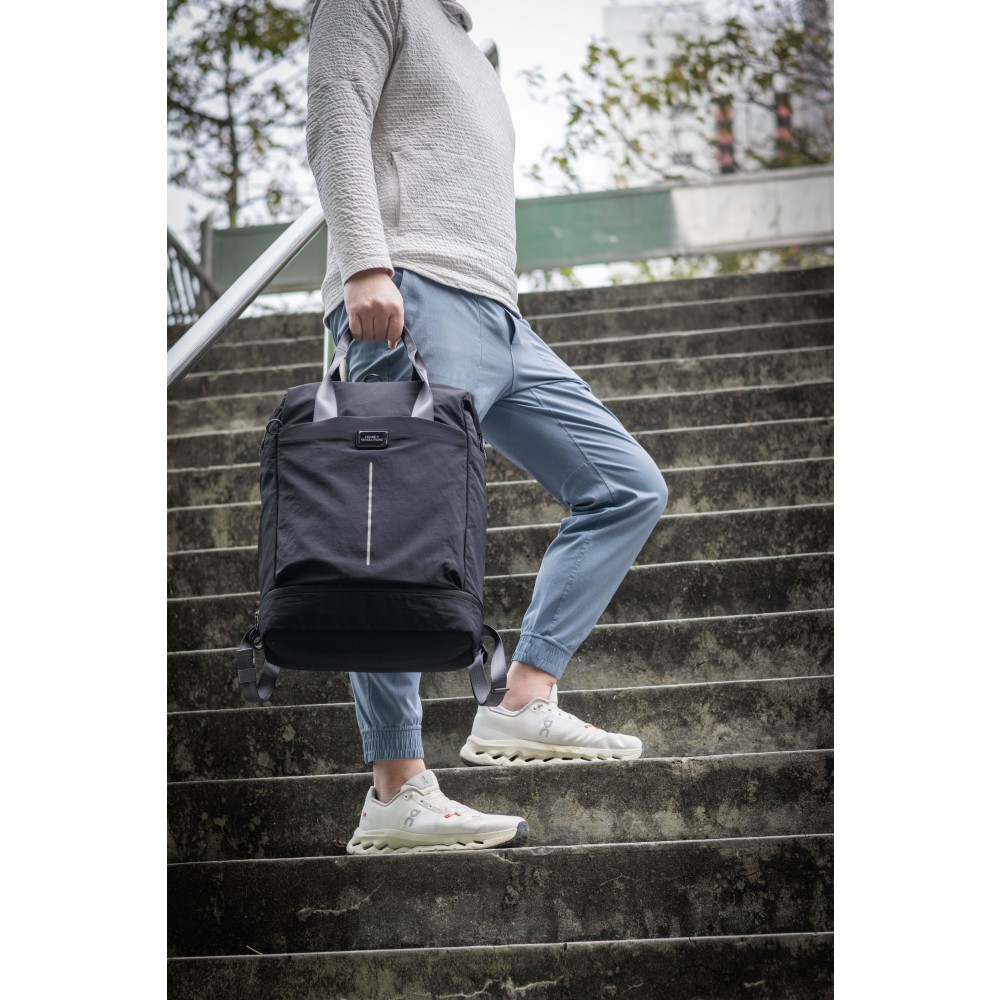 Hauler is a sustainable weekender totepack from the Urban Vibe Collection, where style meets mindful living. Made from ultra-light and durable recycled nylon, it weighs just 650 g and combines a vintage-inspired texture with modern functionality. Designed for everyday movement or weekend escapes, it features a 23 l capacity with a padded laptop sleeve, shoe compartment, two side pockets, and four internal compartments. Additional features include a self-padded back, trolley strap, reflective details, and water-repellent finish. Whether for commuting, gym visits, or short getaways, the Hauler adapts to your lifestyle with ease.