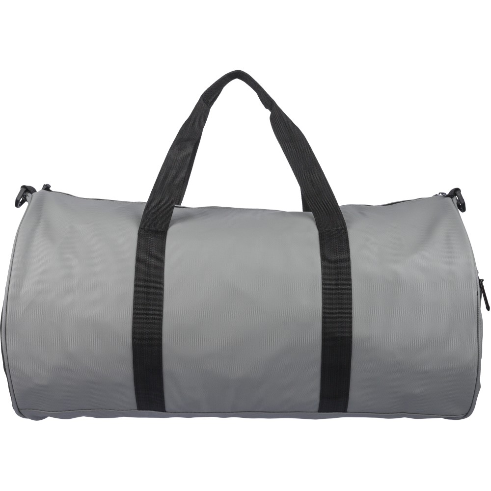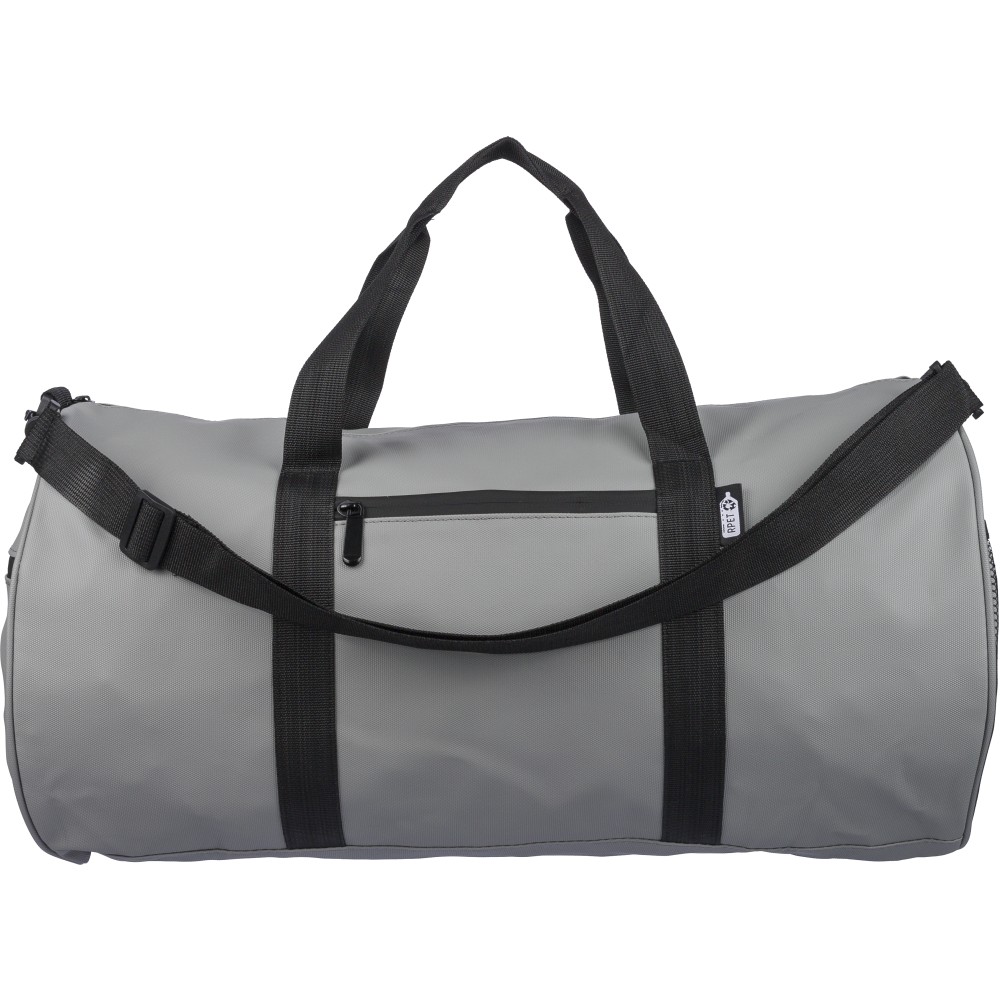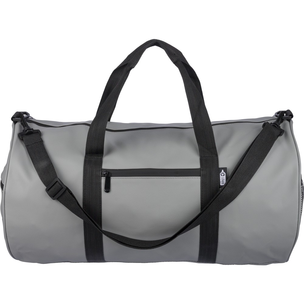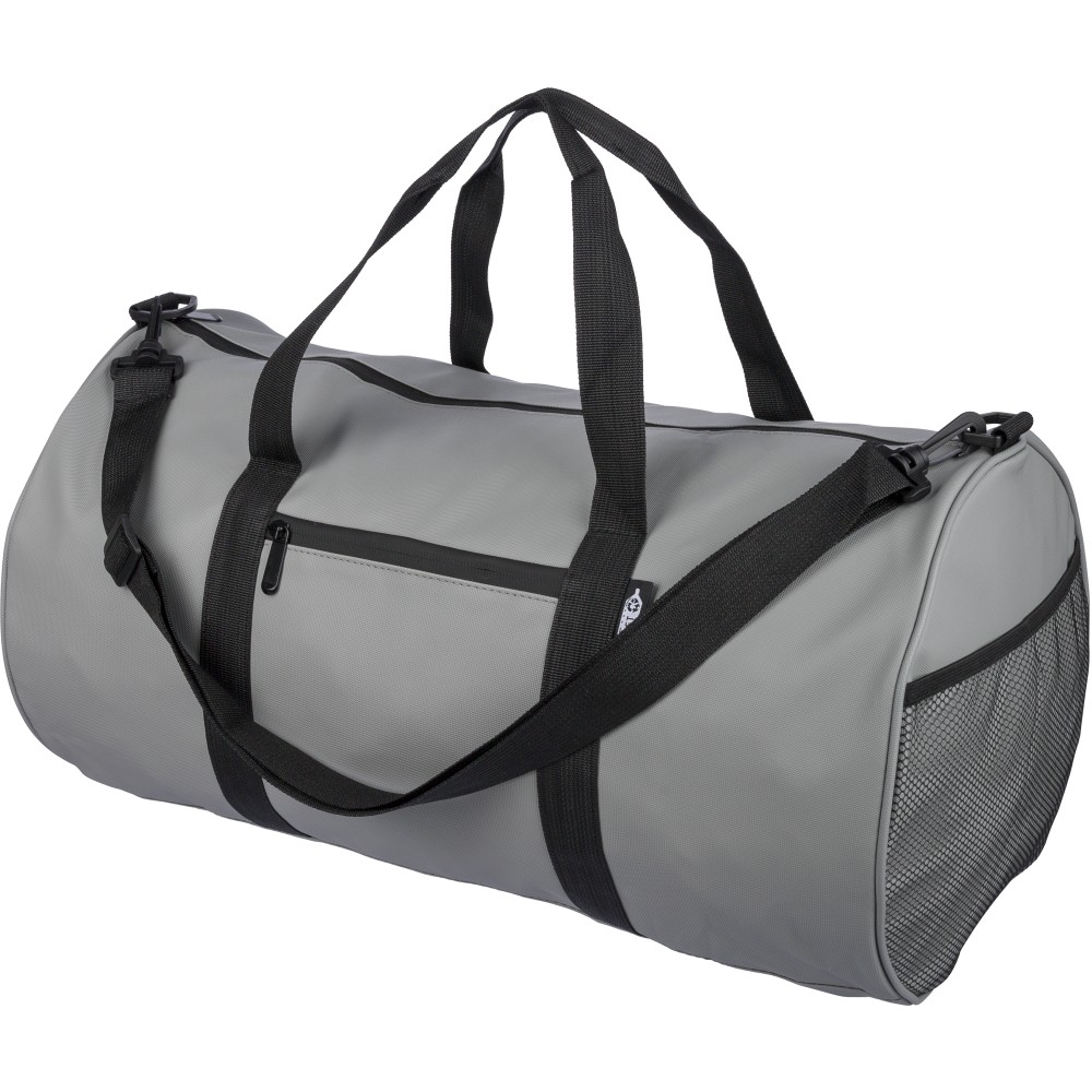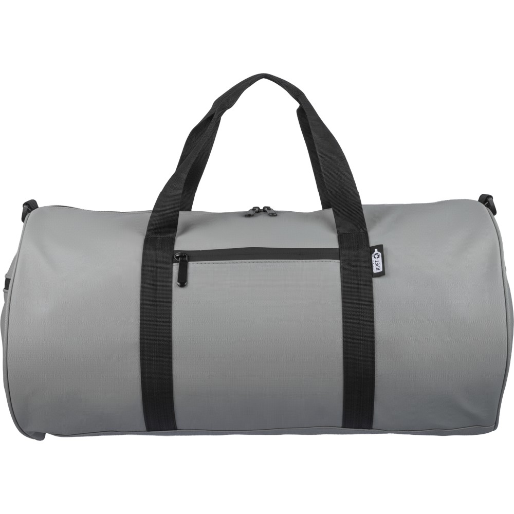 rPET duffle bag made from 600D polyester with 210D lining and water-repellent PU coating. Features a 40 l main compartment, front and side zippered pockets, mesh side pocket, two handles, and adjustable shoulder strap. Includes external rPET label.
