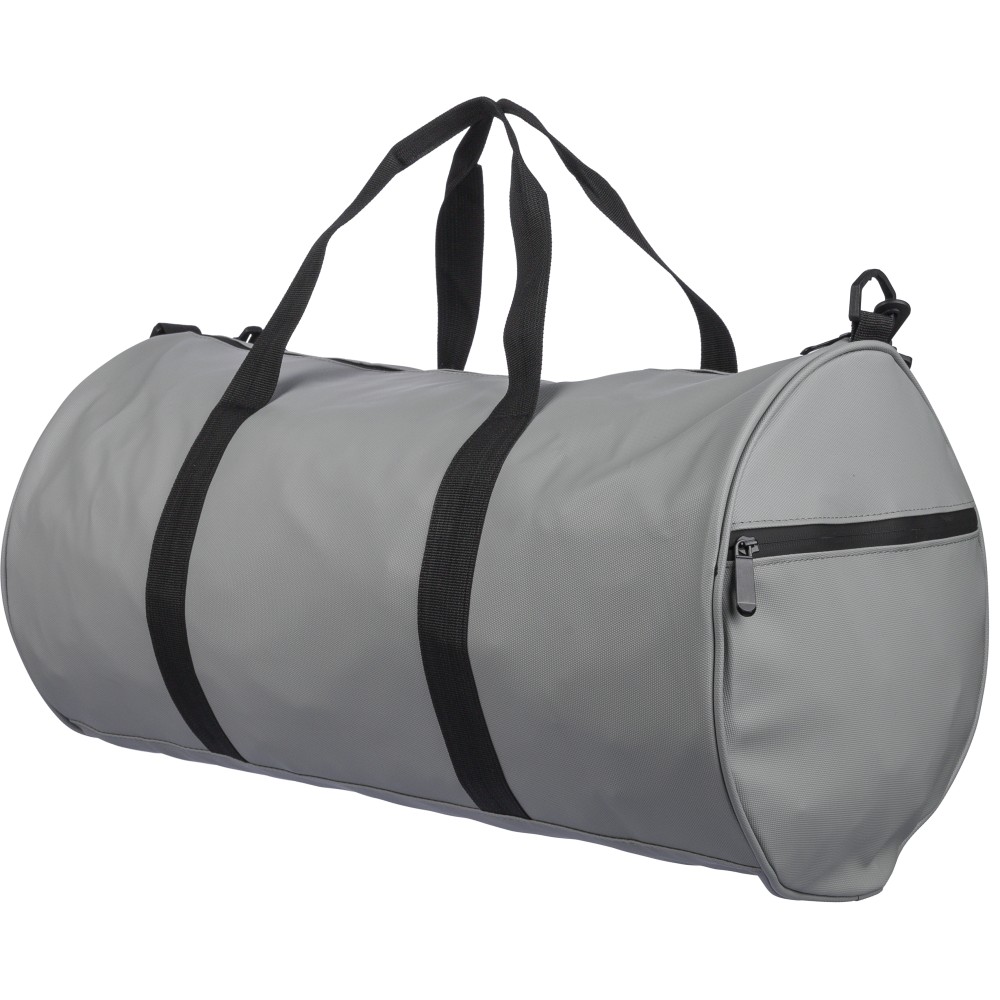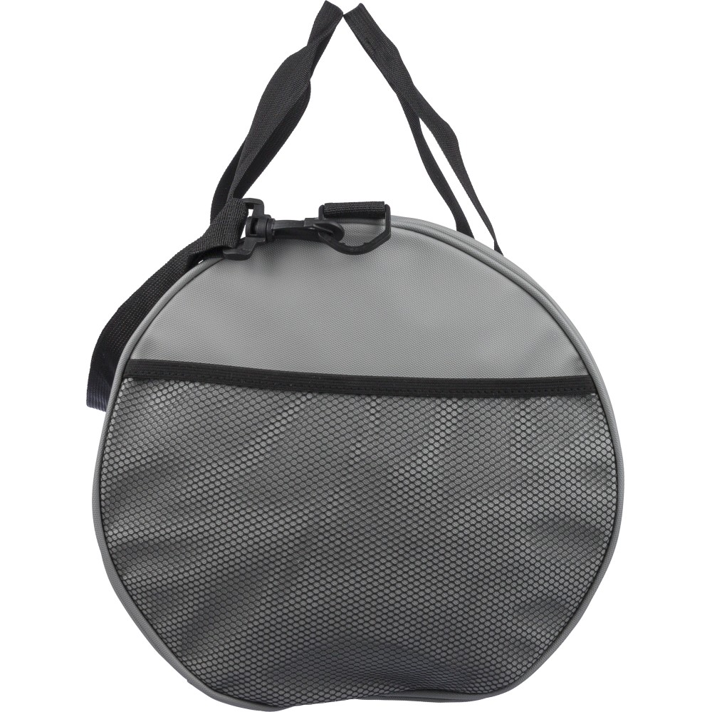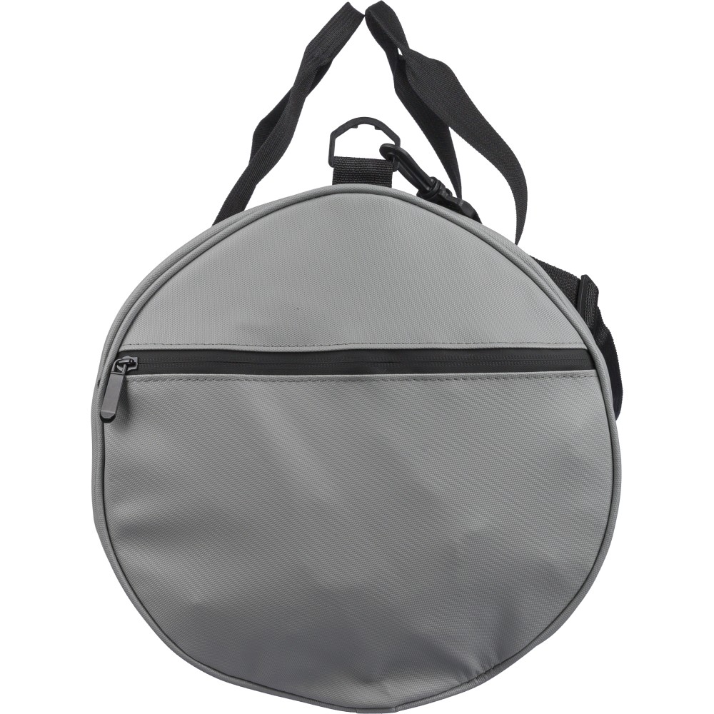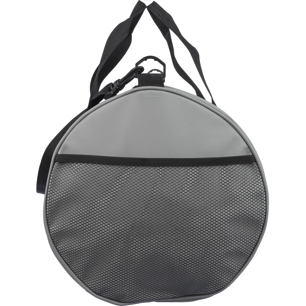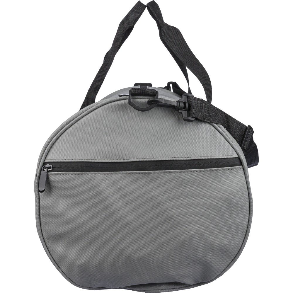 rPET duffle bag made from 600D polyester with 210D lining and water-repellent PU coating. Features a 40 l main compartment, front and side zippered pockets, mesh side pocket, two handles, and adjustable shoulder strap. Includes external rPET label.