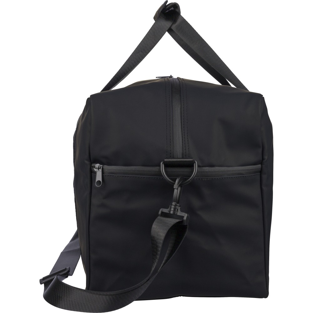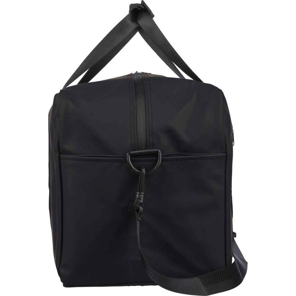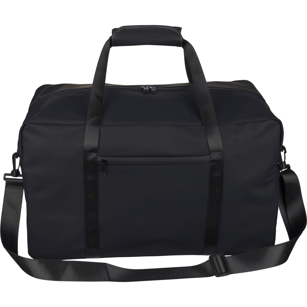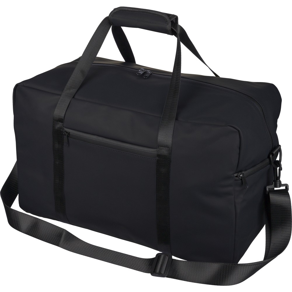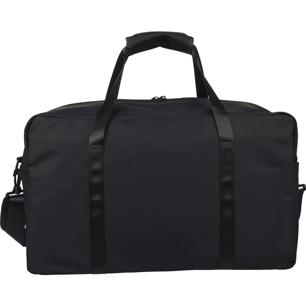 Recycled PU duffle bag (35 l) with 210D recycled polyester lining. Features 108 cm handles (2.5 cm wide) with velcro, 130 cm adjustable strap (3.9 cm wide), front zip pocket, and large main compartment. Recycled logo inside the label. Printing: Screen-printing