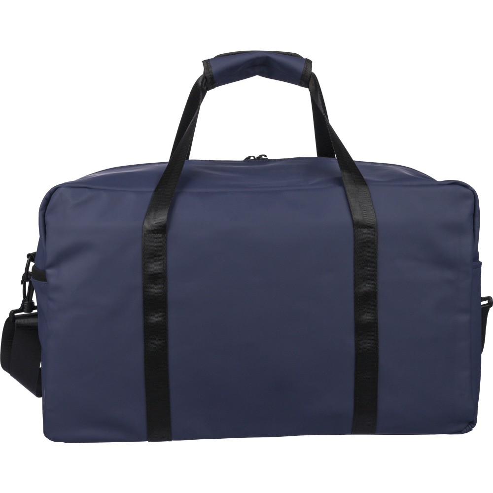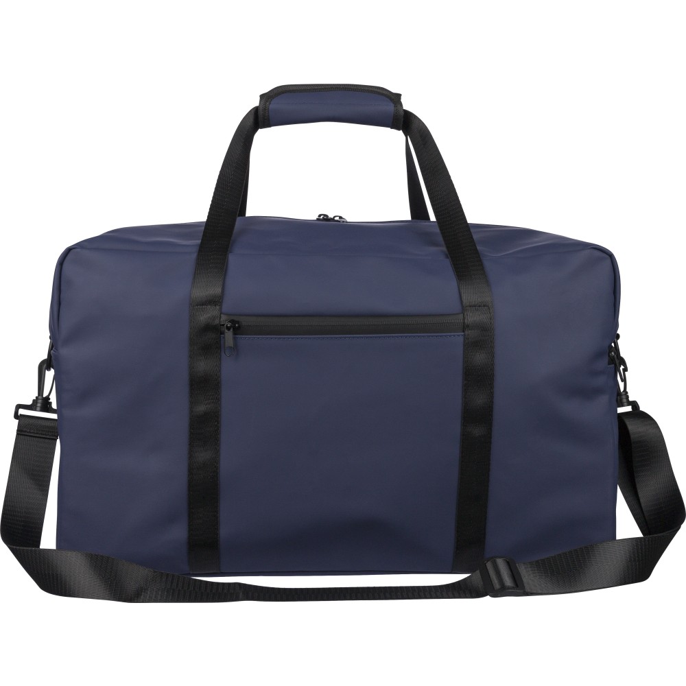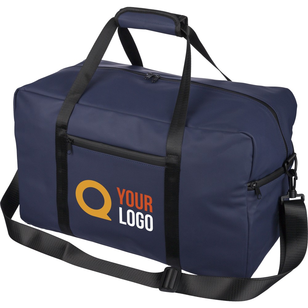 Recycled PU duffle bag (35 l) with 210D recycled polyester lining. Features 108 cm handles (2.5 cm wide) with velcro, 130 cm adjustable strap (3.9 cm wide), front zip pocket, and large main compartment. Recycled logo inside the label. Printing: Screen-printing