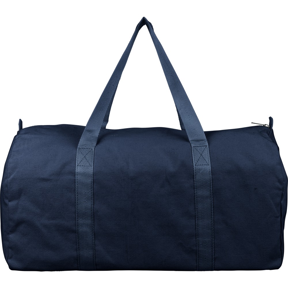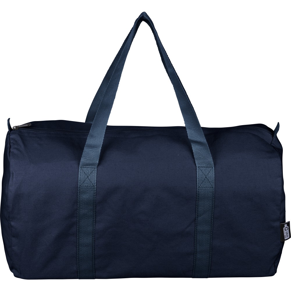 Recycled polycotton (330 gsm) duffle bag with large zippered top compartment. Features long carrying handles (100 cm length, 3 cm width) and matching webbing. Approx. 30 litre capacity. Includes rPET label on the outside and a recycled label inside. Printing: Screen-printing
