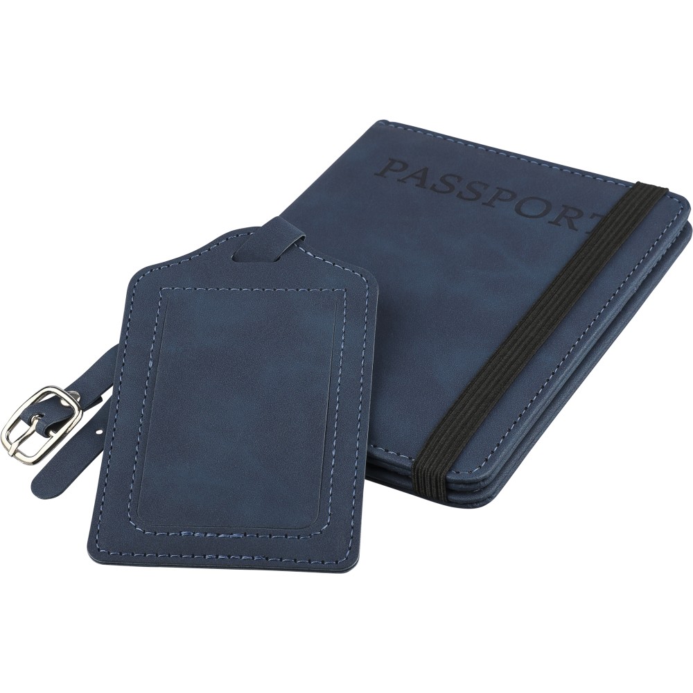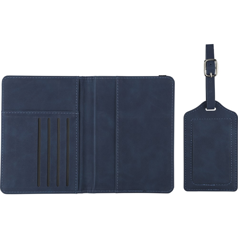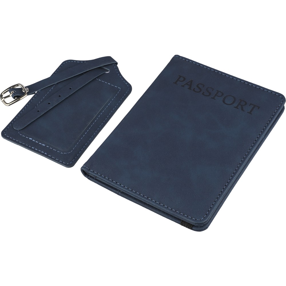 Recycled PU passport holder and recycled PU luggage label packed together in a brown carton box with illustration. The passport holder features ?passport? printed on the front and has two inside slots for securely holding a passport. Both items are finished with an embossed recycled logo.