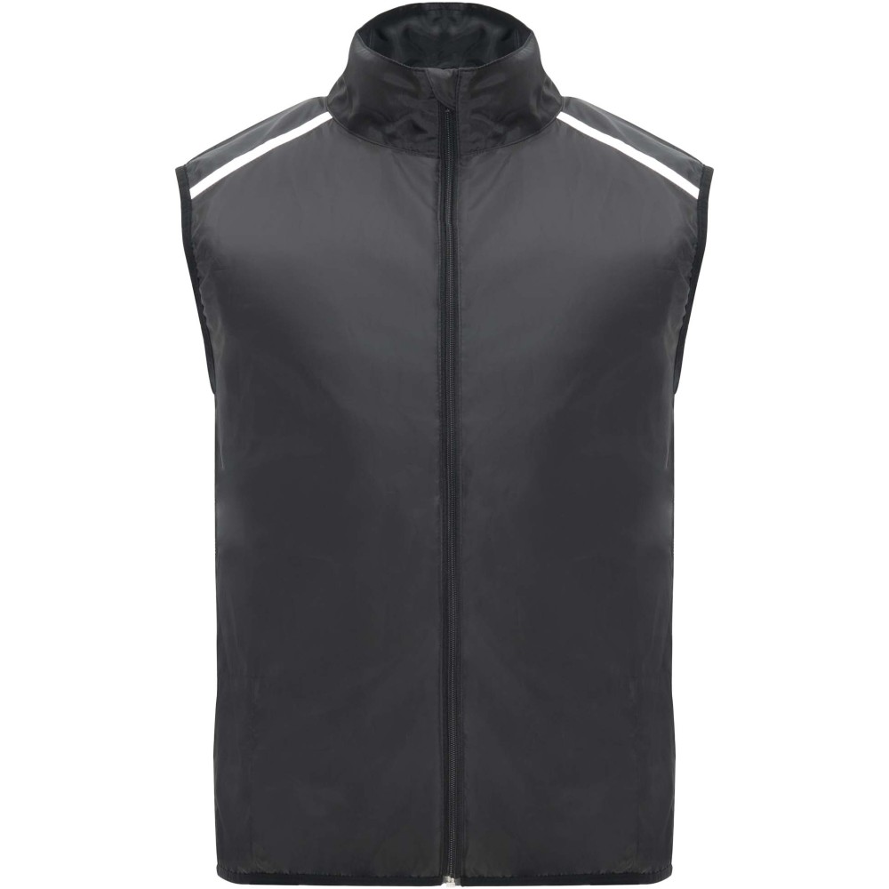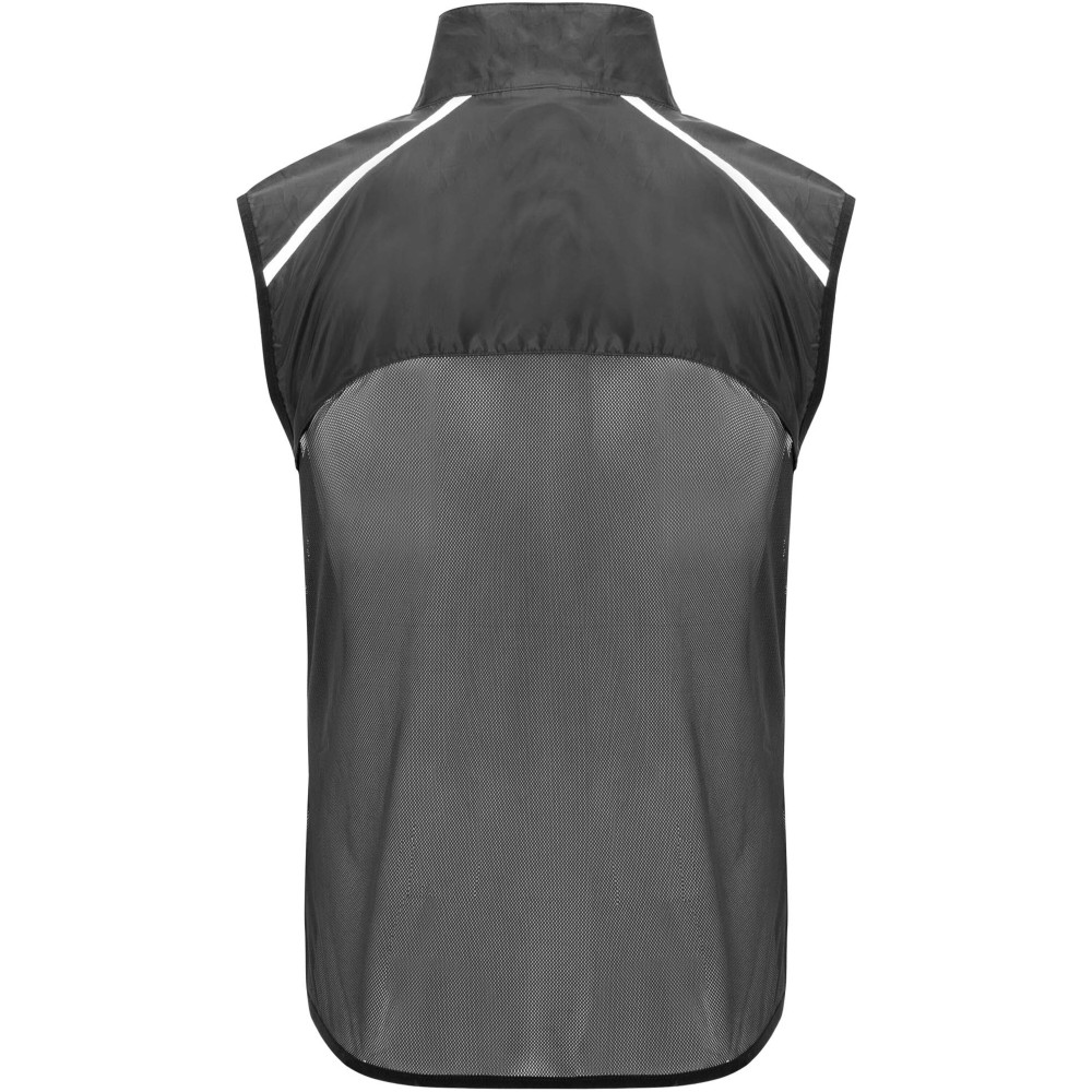 Wind-proof and breathable. Front zip with matching chin protector. Elastic binding at armhole and bottom. Bottom part of the back in microperforated fabric. High-visibility details on the top, front and back. Pocket with elastic strap to stow the vest and wear it on the wrist. Removable label. Printing: Screen-printing
