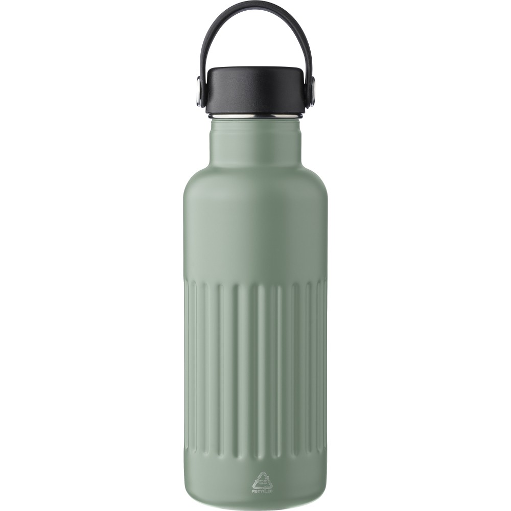 Recycled stainless steel double-walled drinking bottle (500 ml). The interior is made of stainless steel 304, and the exterior is stainless steel 201 with a ridge grip design. Features a PP and iron lid with a TPE handle for easy carrying. Includes an engraved recycled logo on the body. Individually packaged in a brown cardboard box. Printing: Mug-personalization, Engraving