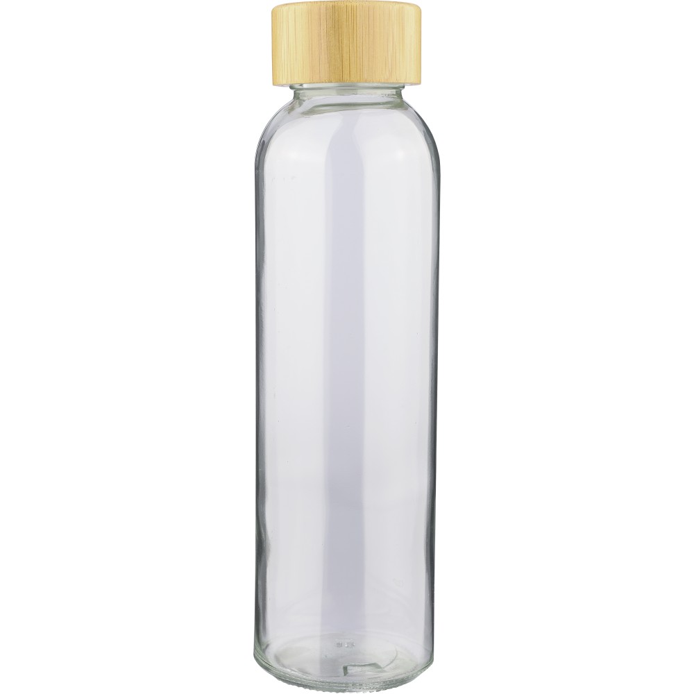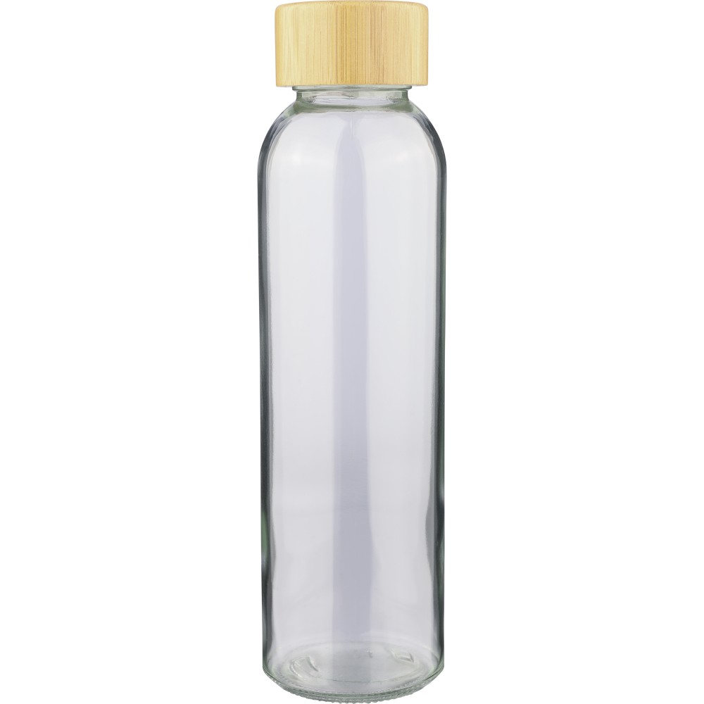 Glass drinking bottle (500 ml) with a frosted coated body and bamboo screw lid with PP inner core. Made from sodium calcium glass, suitable for cold drinks only. Individually packaged in a brown cardboard box.